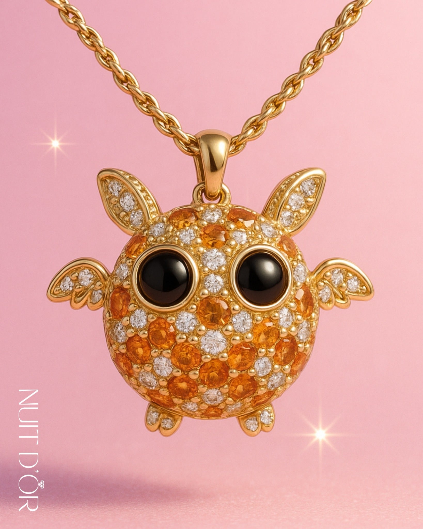 A burst of brilliance Our golden owl spreads its wings in sparkling diamonds and fiery gems — charm meets luxury