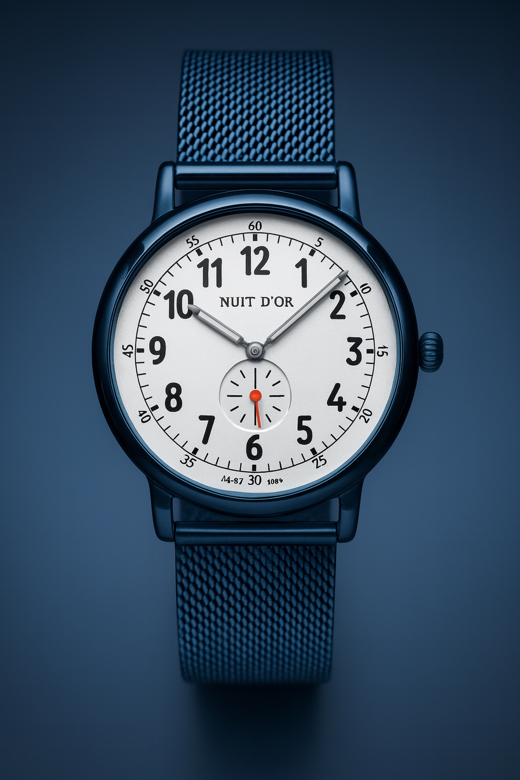 5 ATM, Blue IP plated stainless steel case with a mesh bracelet, white dial, luminous hands, Sapphire crystal, Case diameter: 40 mm