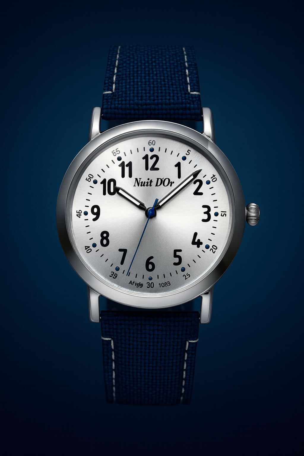 5 ATM, Silver tone plated stainless steel case with a blue nylon strap, silver dial with silver accents, luminous hands, Sapphire crystal, Case diameter: 40 mm