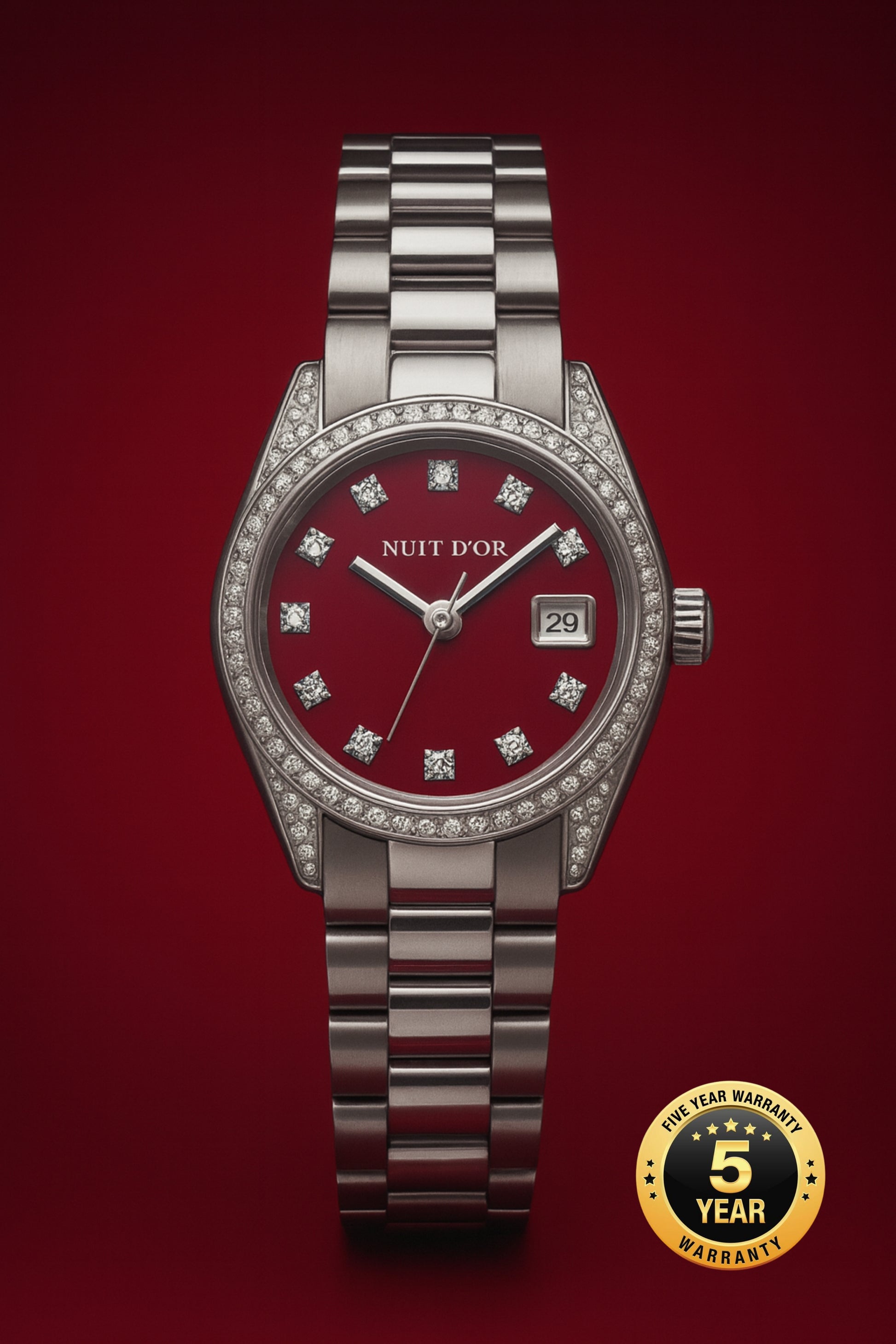 10 ATM, 11 genuine diamonds, Stainless steel case with 80 Swarovski crystals, Stainless steel bracelet, Diver security lock buckle, Screw down crown, Sapphire crystal with lens, Case diameter: 29.8 mm