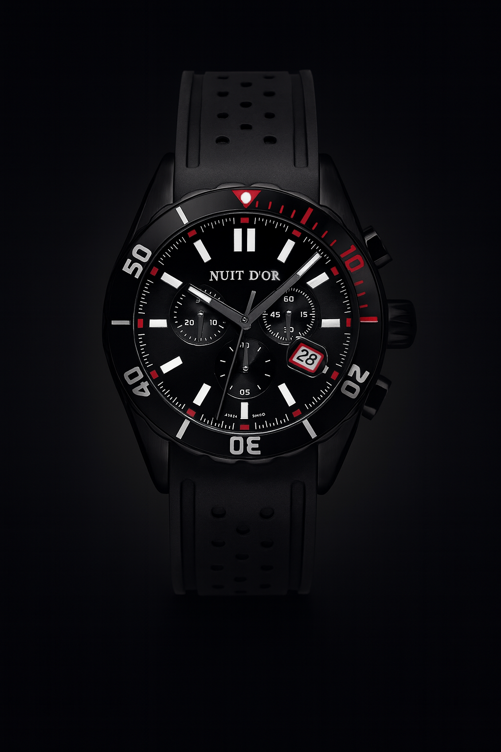 10 ATM, Swiss chronograph, Stainless steel case, Custom molded rubber strap, One-directional rotating diver bezel, Screw down diver crown, Luminous dial and hands, Sapphire crystal with lens, 30 minute register and 1/10 second counter, Case diameter: 43 mm