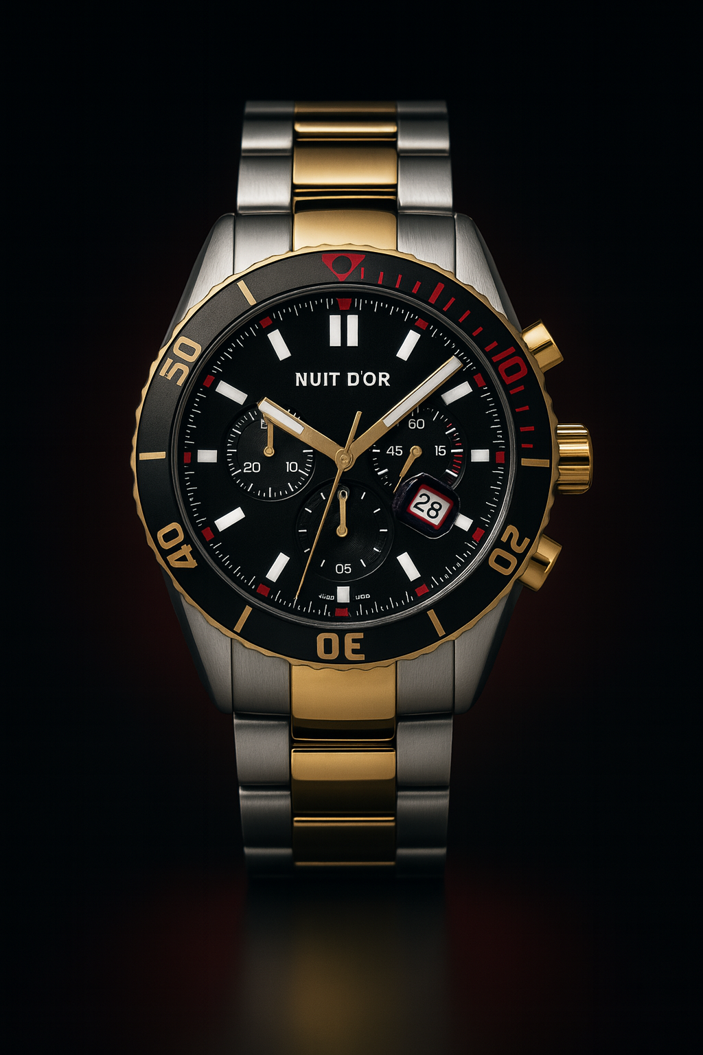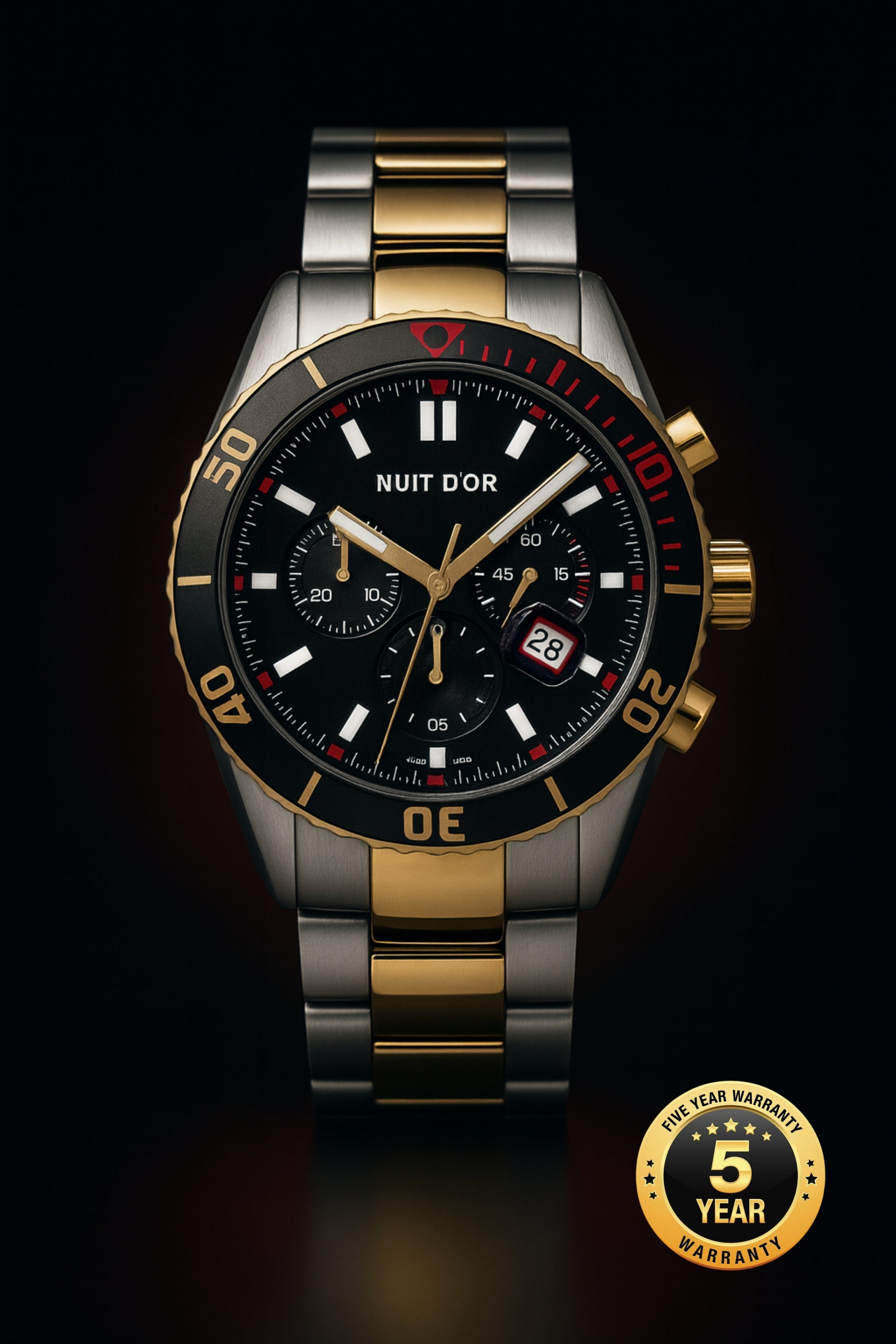 10 ATM, Swiss chronograph, Stainless steel case, Stainless steel bracelet, Diver security lock buckle, One-directional rotating diver bezel, Screw down diver crown, Luminous dial and hands, Sapphire crystal with lens, 30 minute register and 1/10 second counter, Case diameter: 43 mm