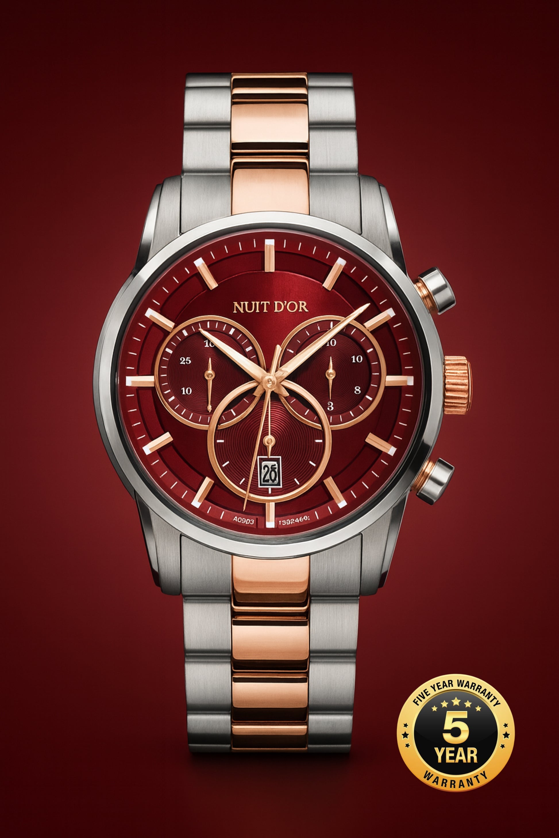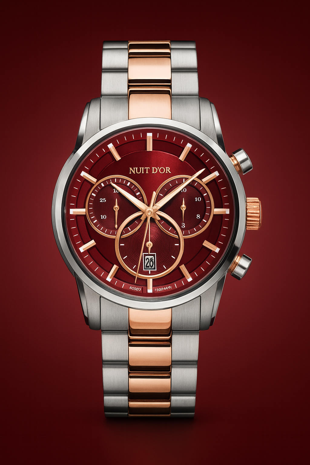 10 ATM, Swiss chronograph, Stainless steel case, Two-tone Stainless steel bracelet, Rose gold elements, Diver security lock buckle, Luminous dial and hands, Sapphire crystal, 30 minute register and 1/10 second counter, Case diameter: 43 mm