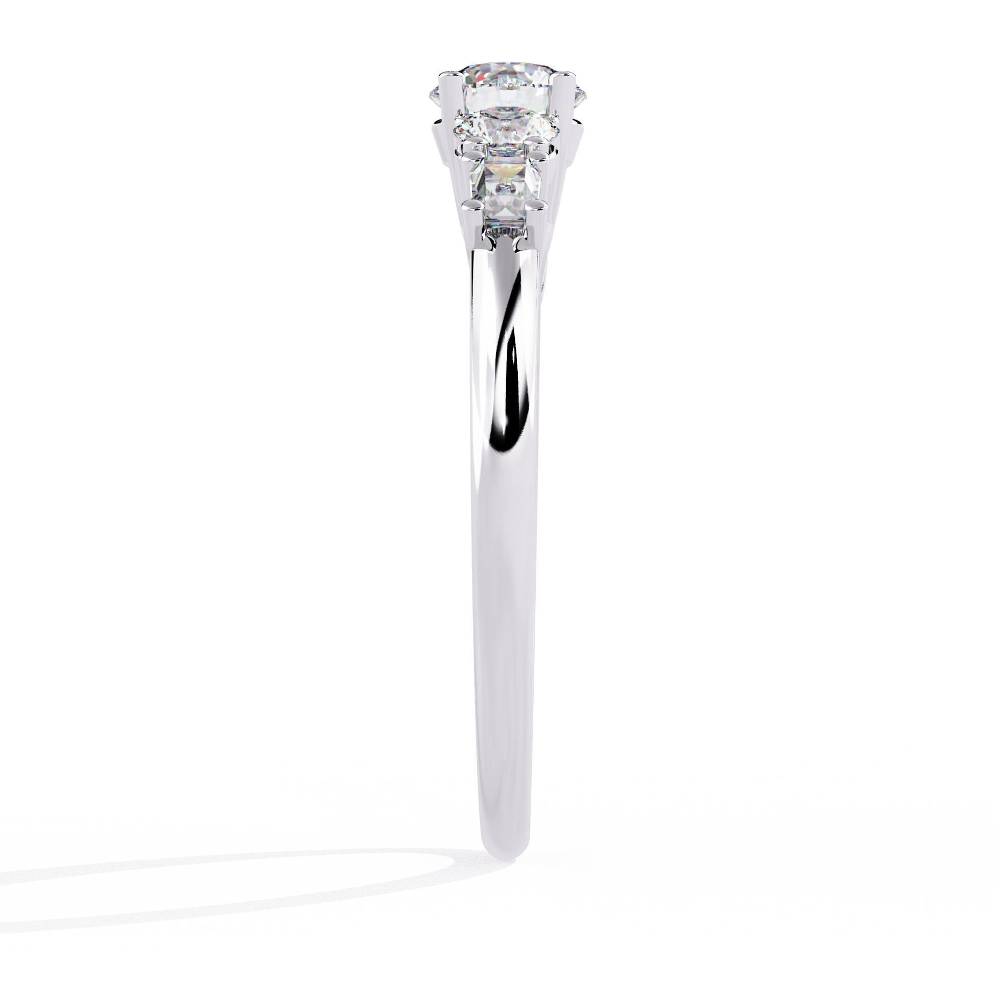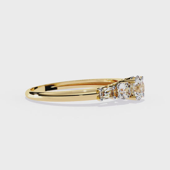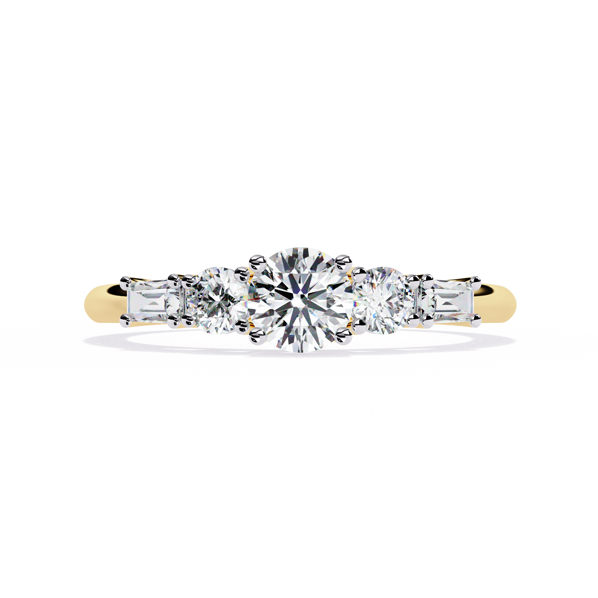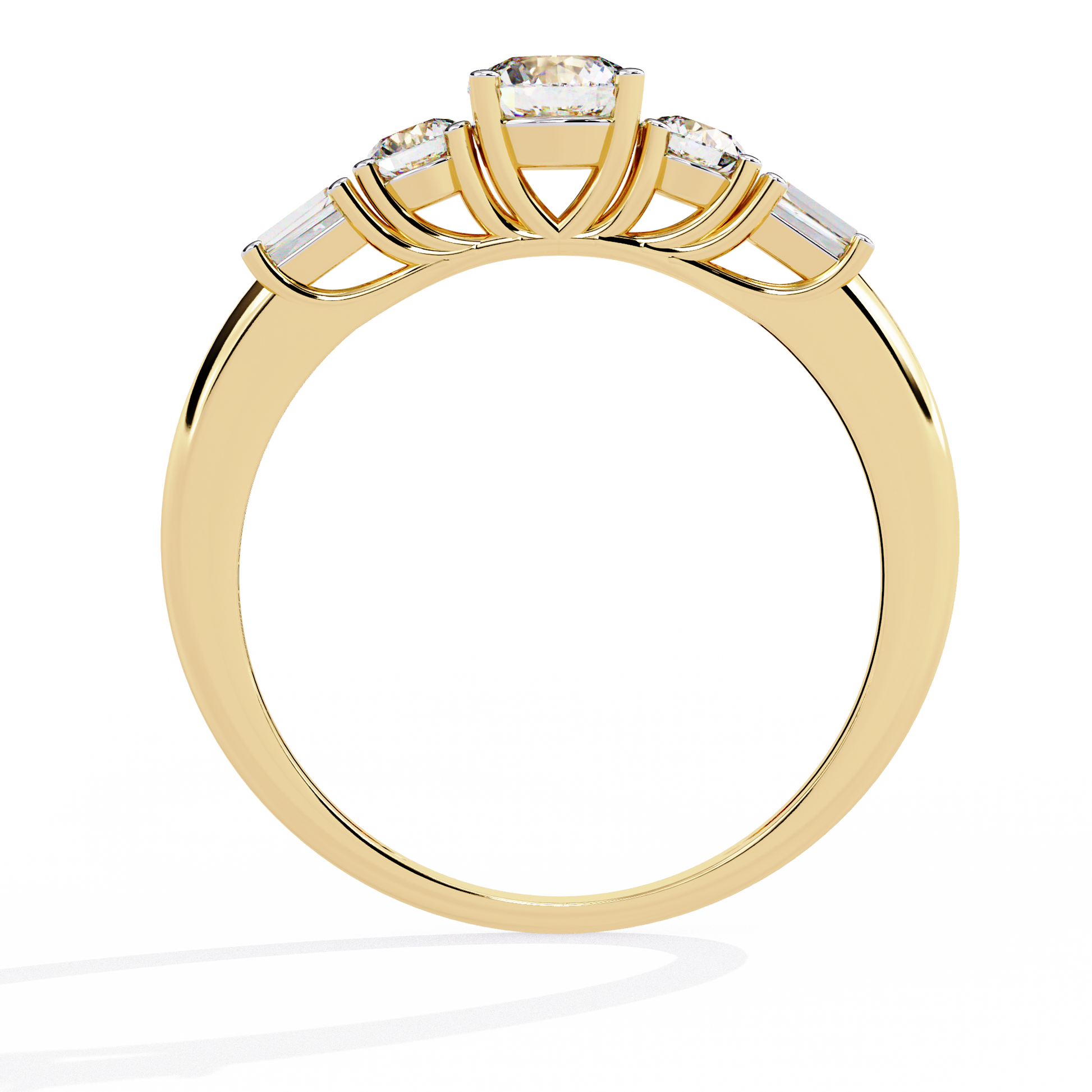 Specifications: • Style Number: RING116 • Gold Purity: 14K Gold (Yellow, White, or Rose) • Gold Weight: 2.0 grams (14K), 2.4 grams (18K) • Diamond Type: Lab-grown Diamond • Diamond Shapes: Round, Tapered Baguette • Diamond Count: 3 stones • Round: 1 pc (0.38 ct) • Baguette: 2 pcs (0.16 ct) • Total Diamond Weight: 0.54 carats • Diamond Color: D-E-F • Diamond Clarity: VVS-VS