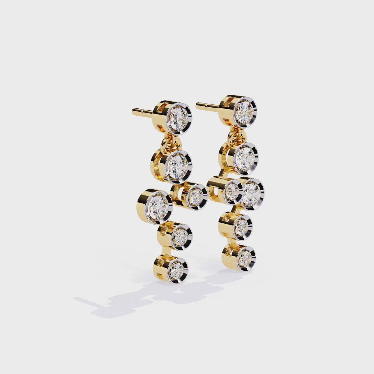 The Cascade Dots earrings feature a graceful vertical arrangement of bezel-set lab-grown diamonds in varying sizes. With fluid movement and refined geometry, this 12-stone design delivers understated sparkle in a modern form—perfect for elevating everyday looks or complementing evening elegance.