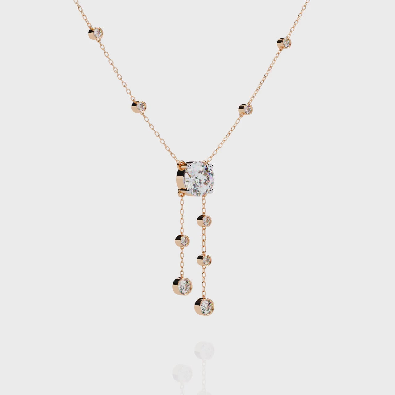 This refined lariat necklace features a cascade of bezel-set round lab-grown diamonds, anchored by a luminous center stone. Designed in polished rose gold, it flows with graceful symmetry and brilliance, offering a contemporary yet timeless appeal.