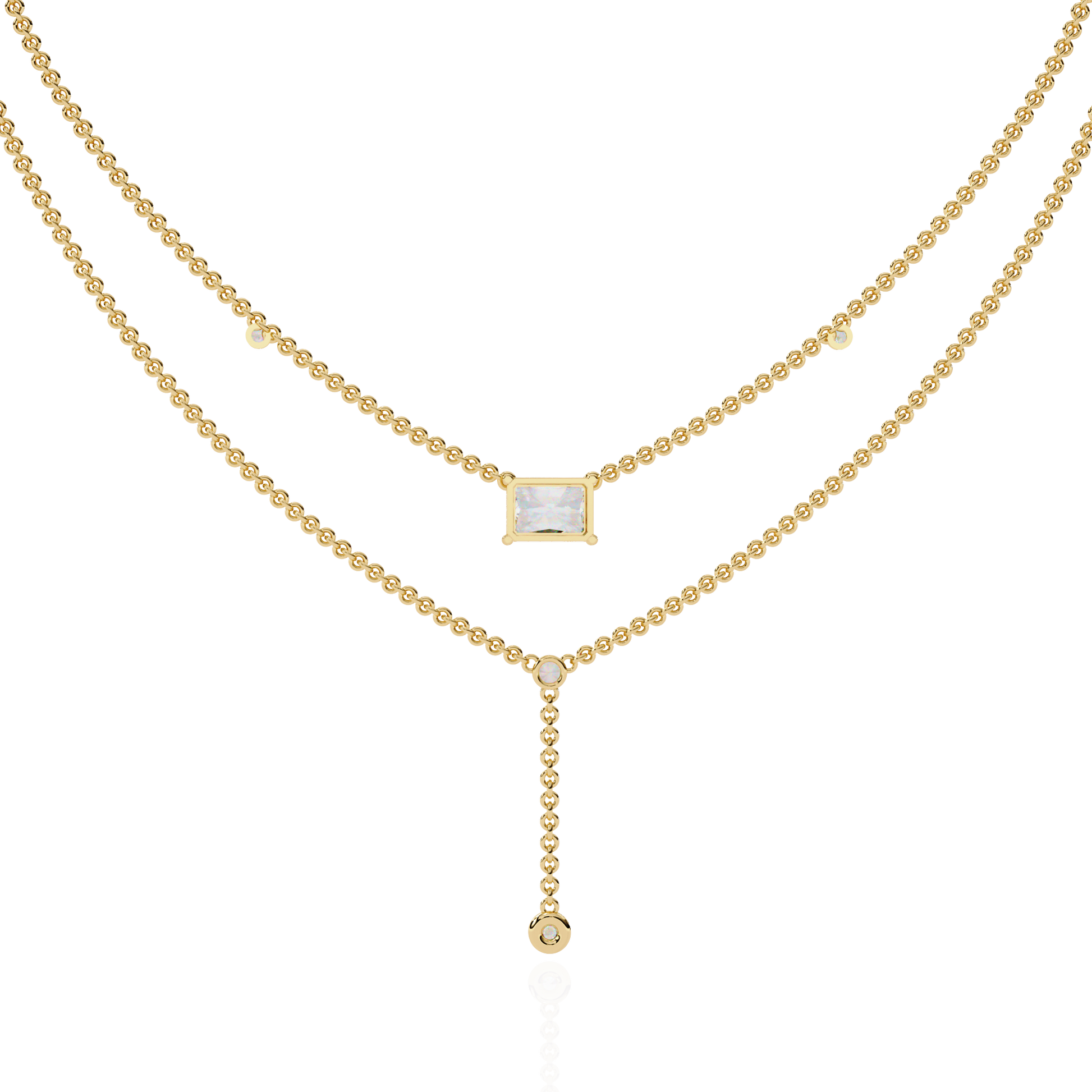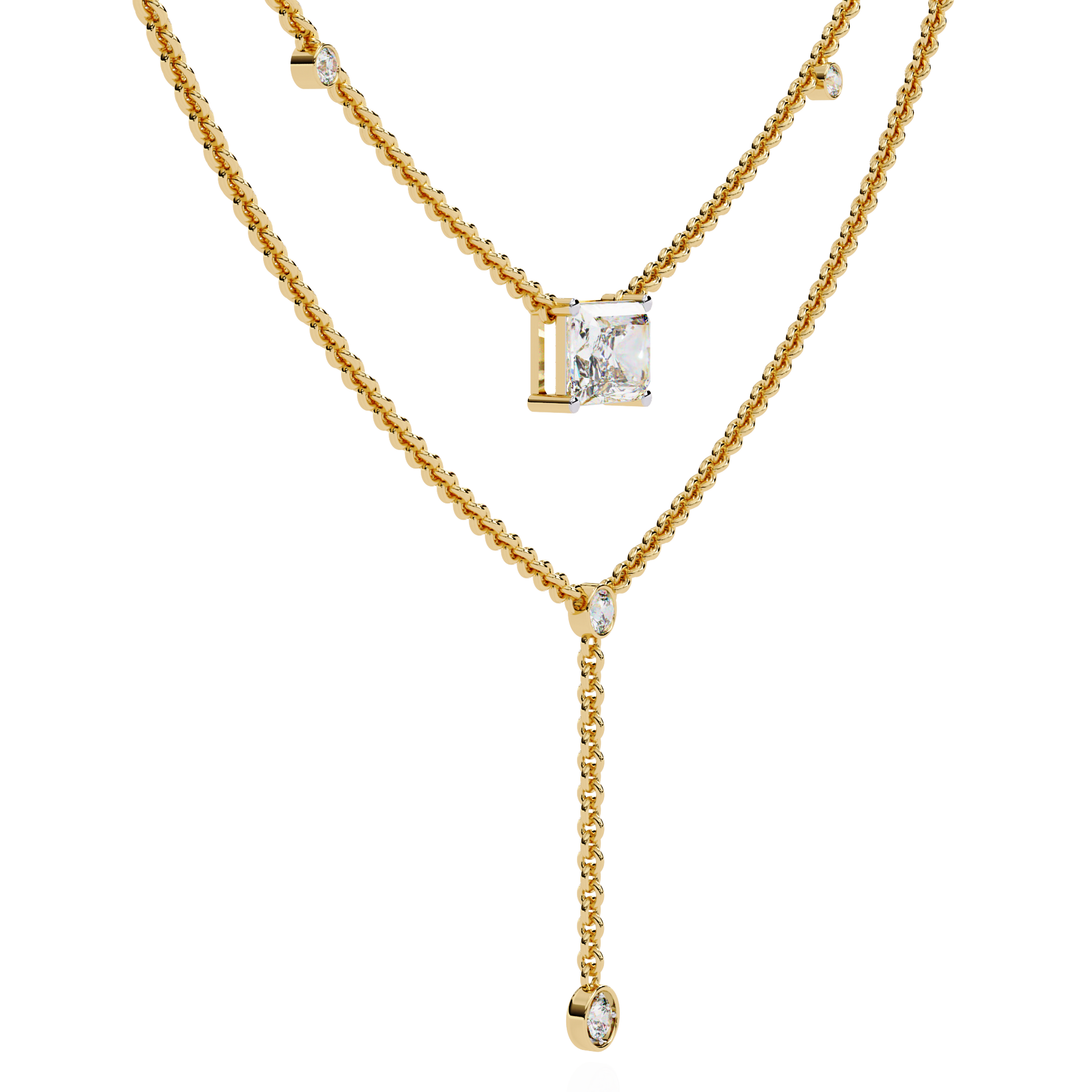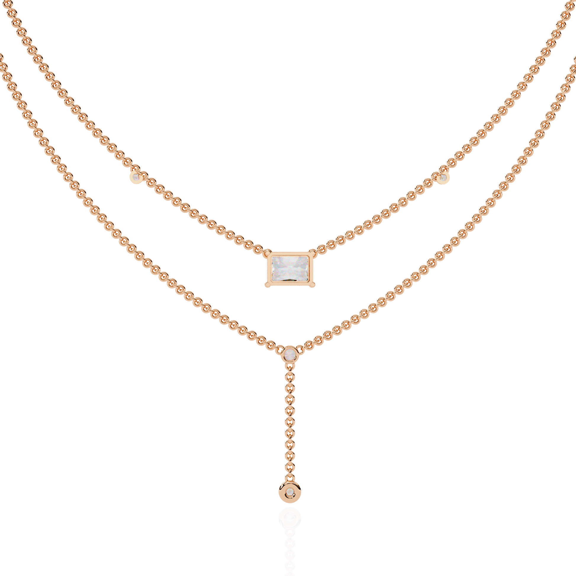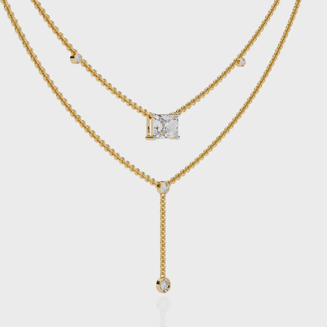 This refined Y-drop necklace combines modern simplicity with a touch of brilliance. A radiant emerald-cut centerpiece is suspended between two chains, accented by floating bezel-set lab diamonds and a 27mm vertical drop. A perfect layered statement for any neckline.