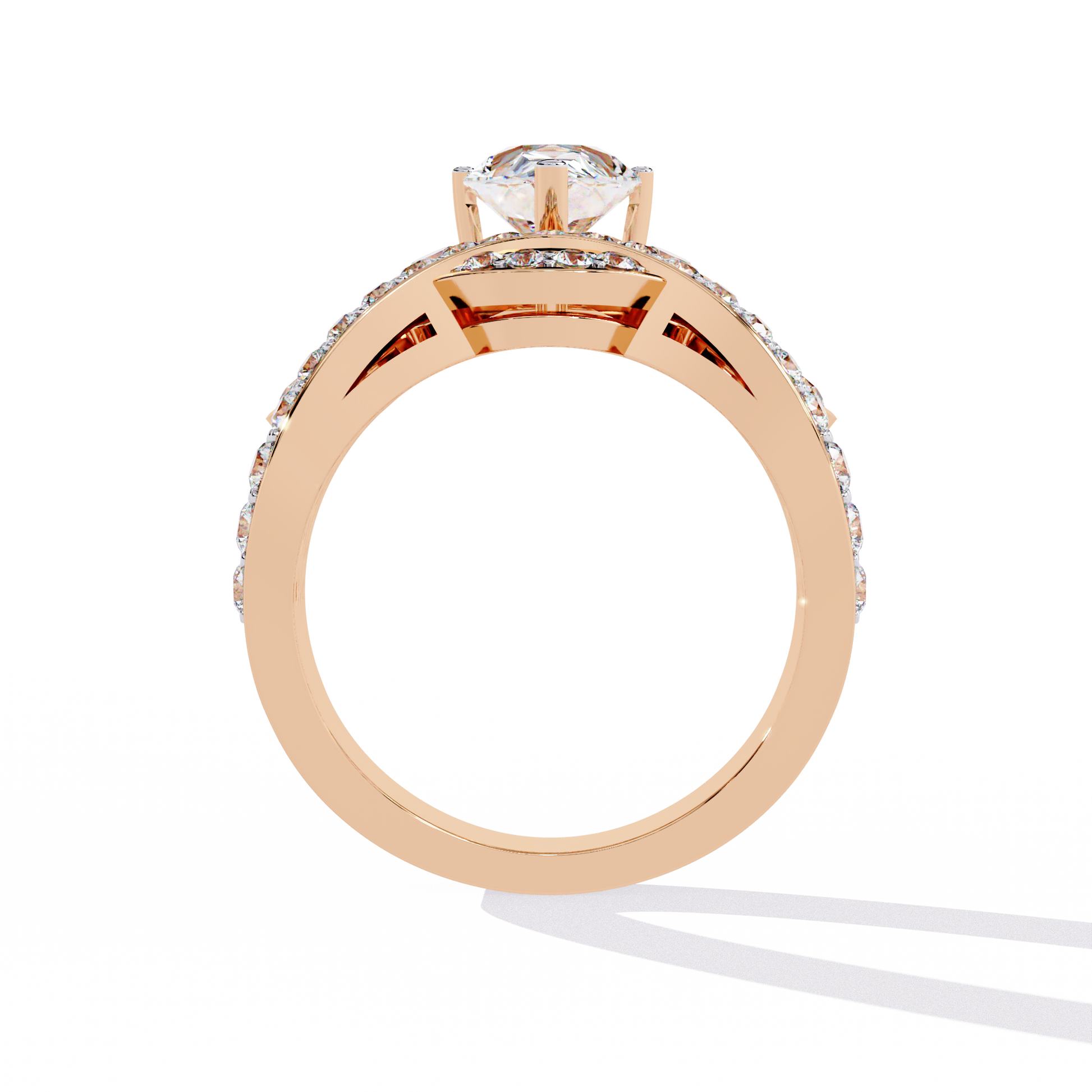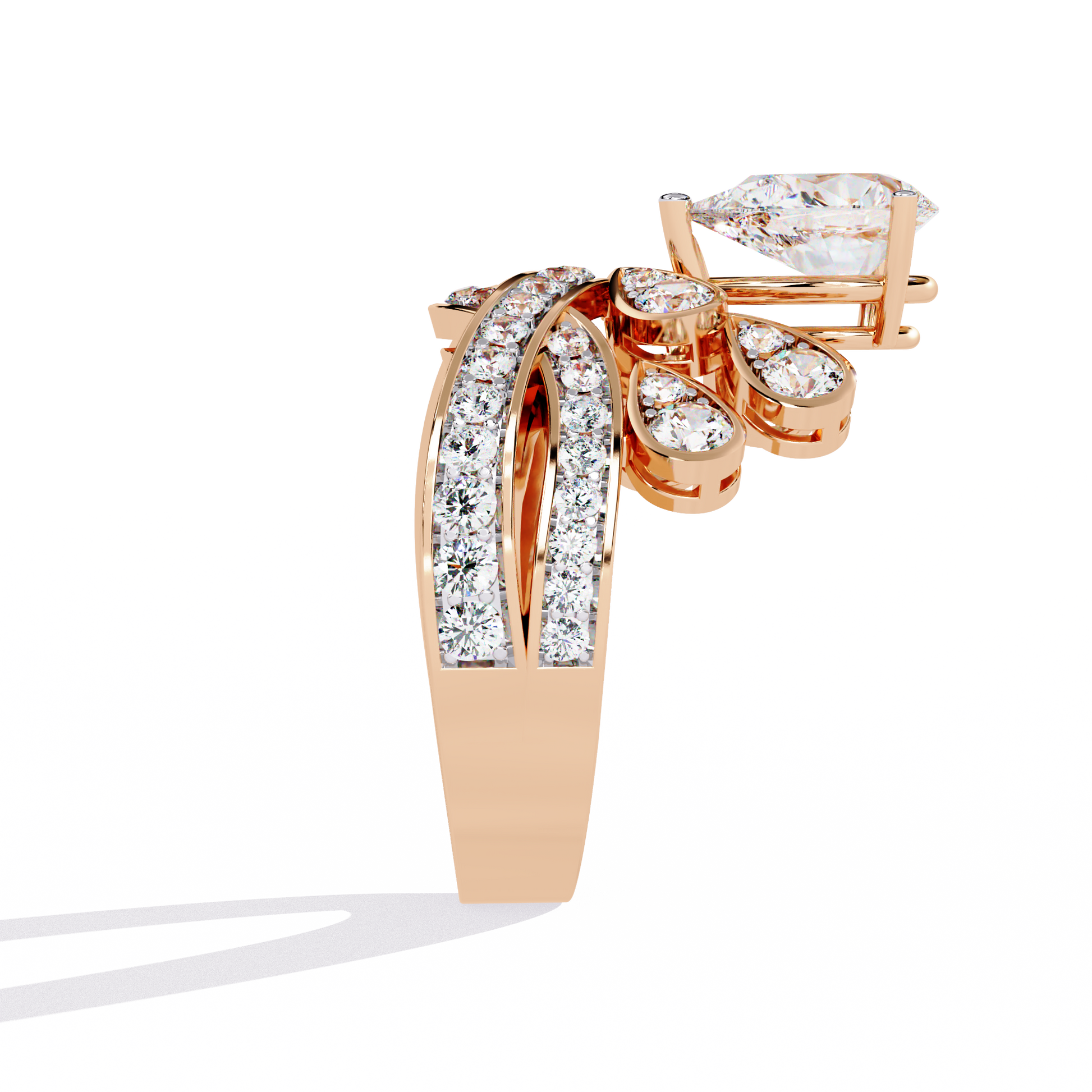 The Celestial Crown ring features a pear-shaped lab-grown diamond set at the crest of a brilliant crown-inspired structure. With flowing scroll motifs and rows of micro-set diamonds, this intricate design balances opulence with precision—crafted to feel like royalty on your hand.