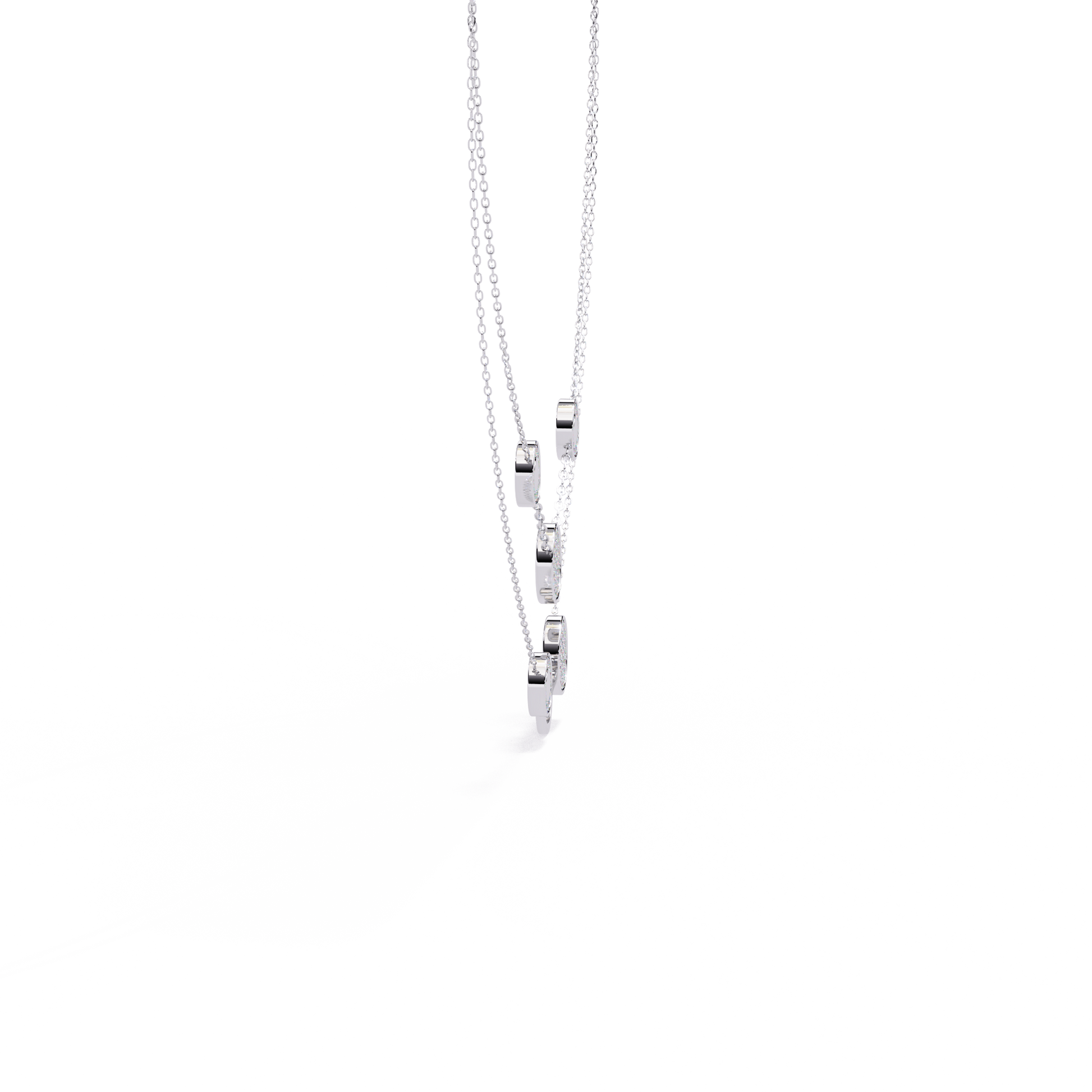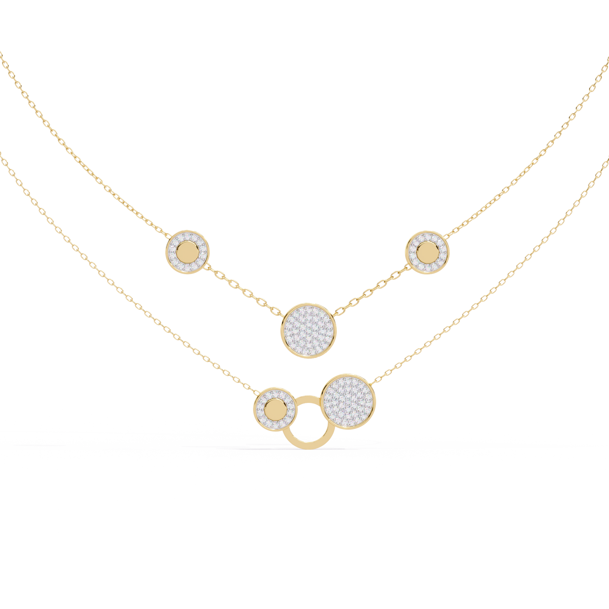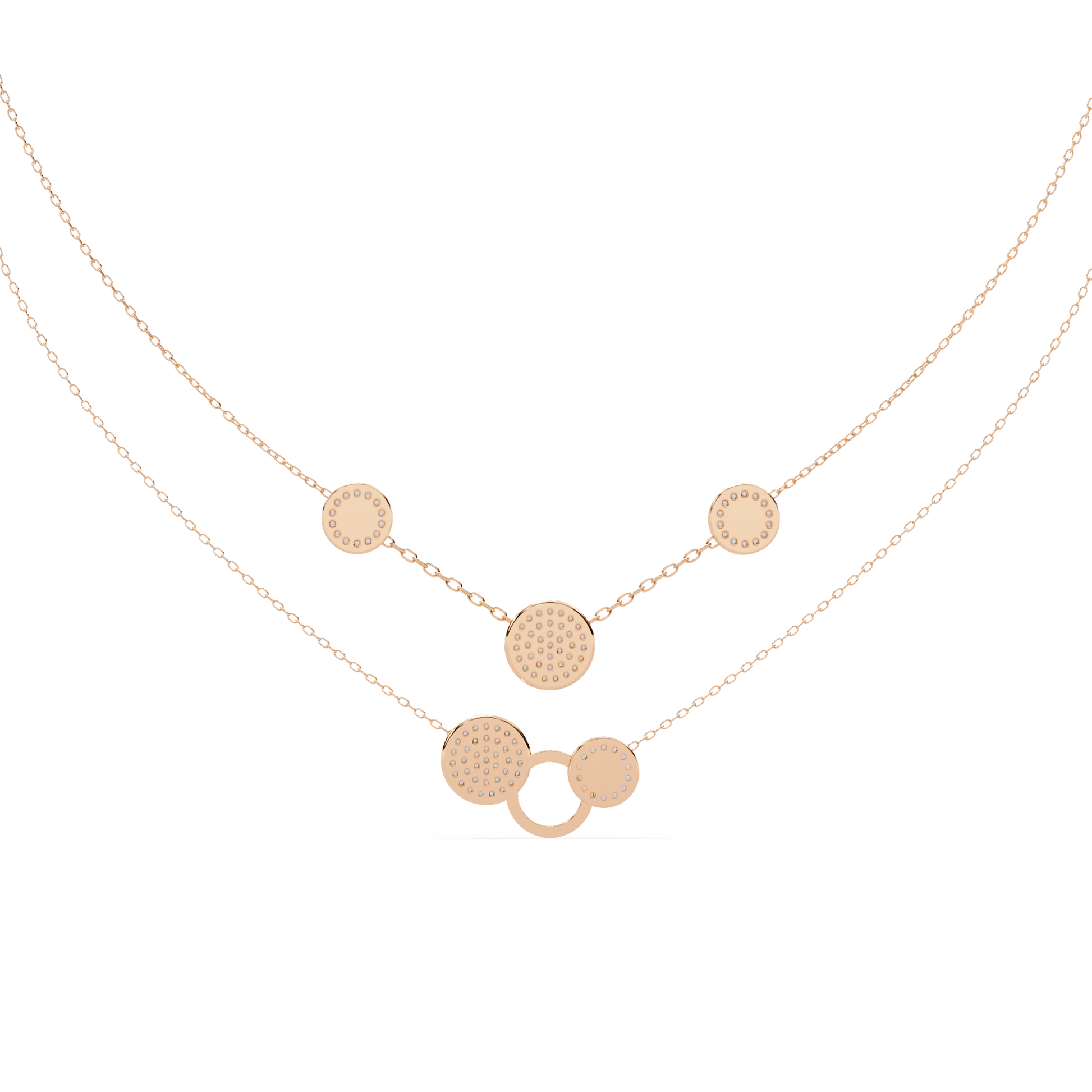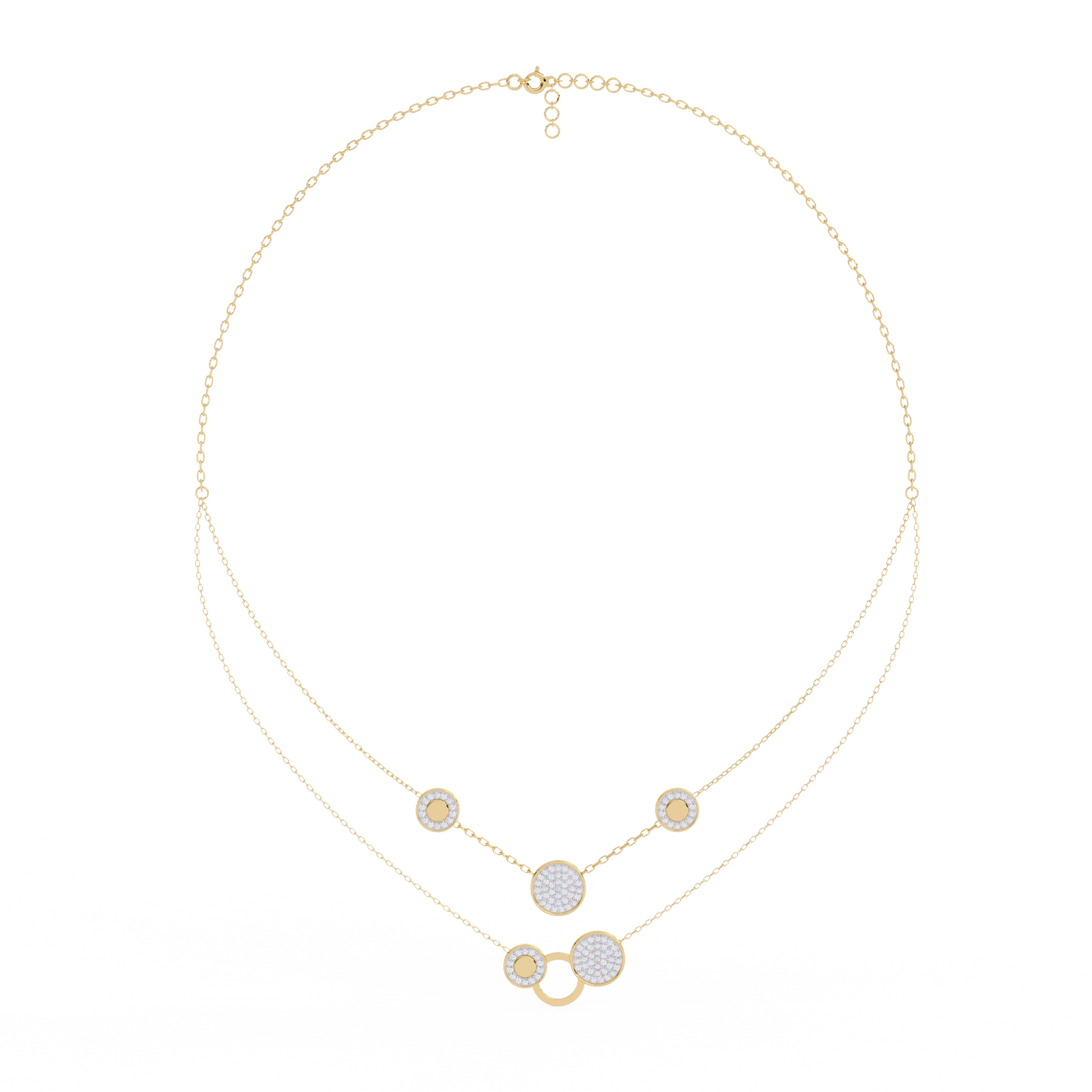 This contemporary piece features a dual-strand chain set with pavé lab-grown diamond medallions, highlighted by a 17.80 mm central charm. The floating disc design delivers effortless elegance and a cosmopolitan edge, crafted with precision in warm rose and white gold tones. A perfect piece for everyday layering or refined solo wear.