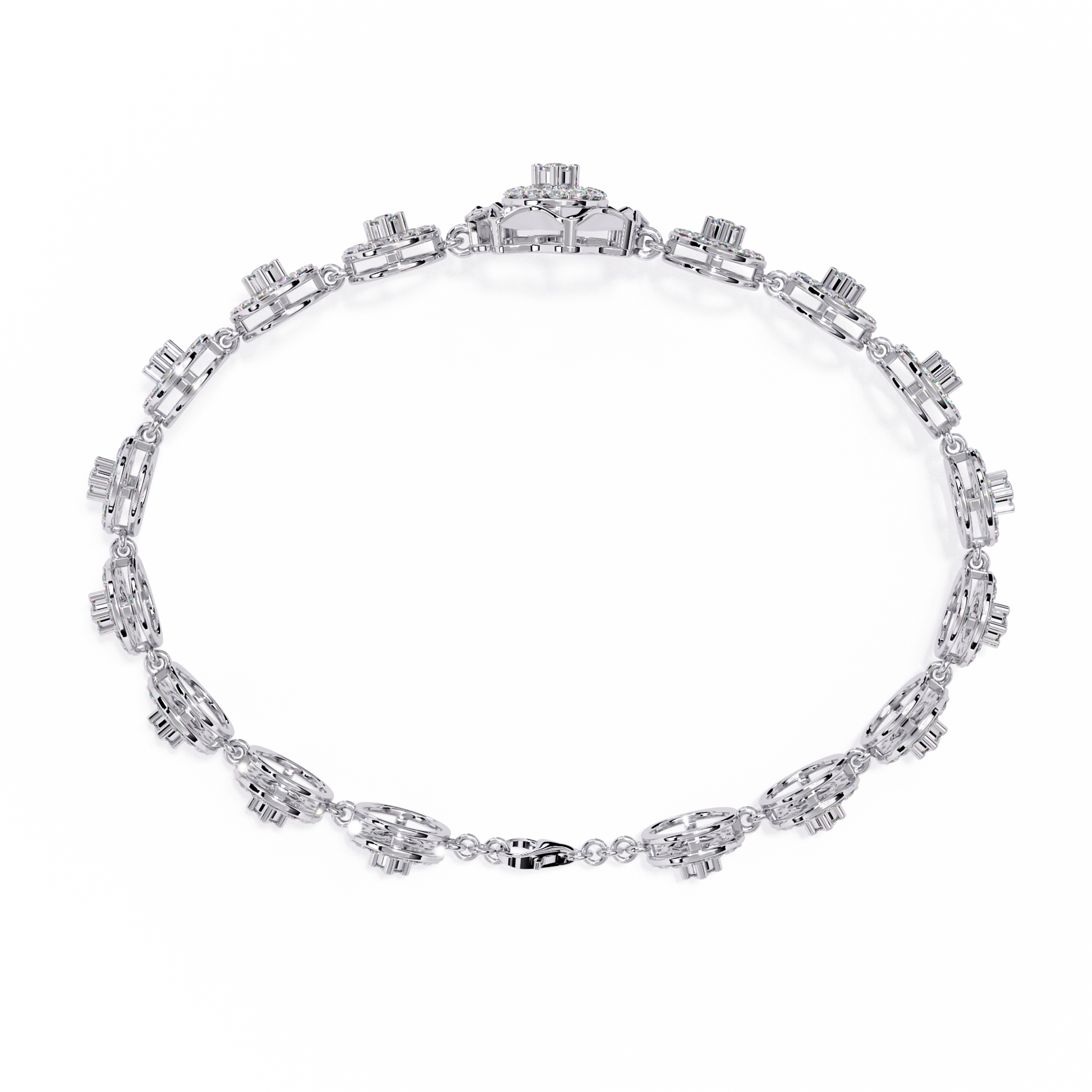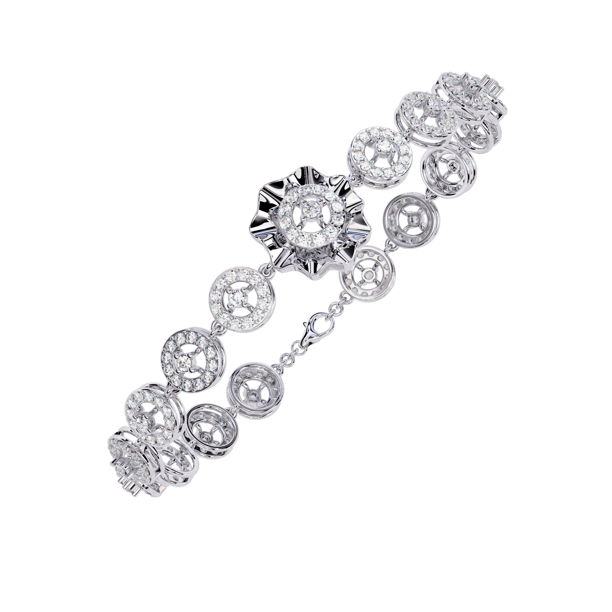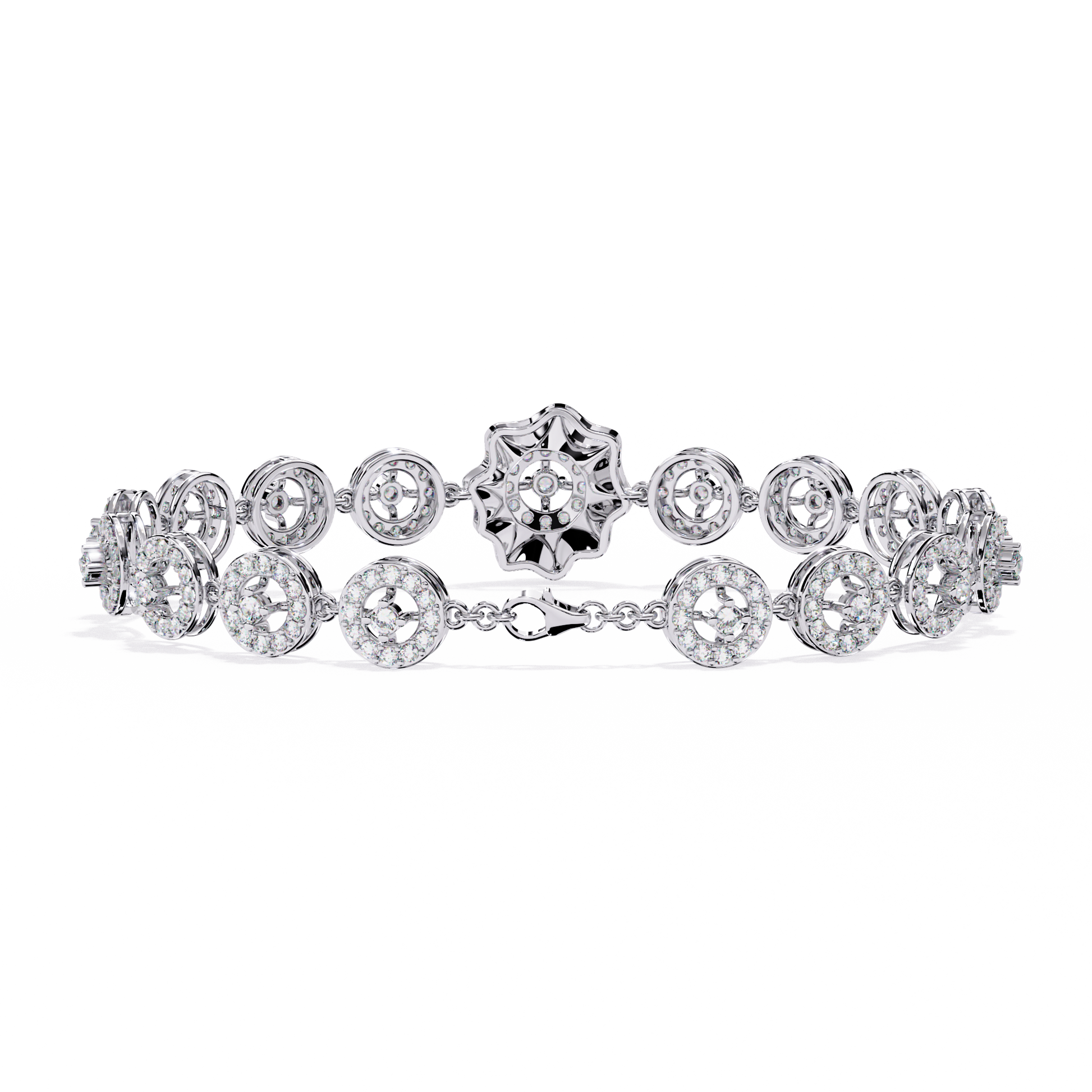 This 7.5-inch bracelet features an intricate pattern of circular links, each encircled with luminous lab-grown diamonds, culminating in a radiant center medallion. Designed with finesse and sparkle, it embodies modern luxury with timeless elegance, perfect as a statement gift or refined heirloom.