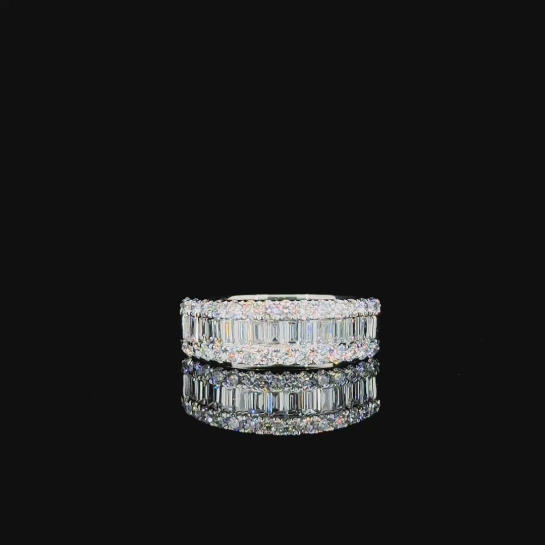 Geometric elegance defines the Chroma Step band, blending 13 baguette and 28 round lab-grown diamonds in a seamless 0.98-carat display. Set in 14K white gold, this structured silhouette offers architectural beauty with balanced brilliance.