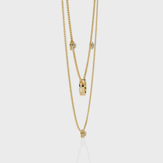 A modern celestial design, this 14K gold necklace features a sculpted 12mm open circle at its center, gracefully suspended between two layered chains. Dainty round lab-grown diamonds accent both tiers, adding brilliance and a sense of effortless luxury to the floating silhouette.