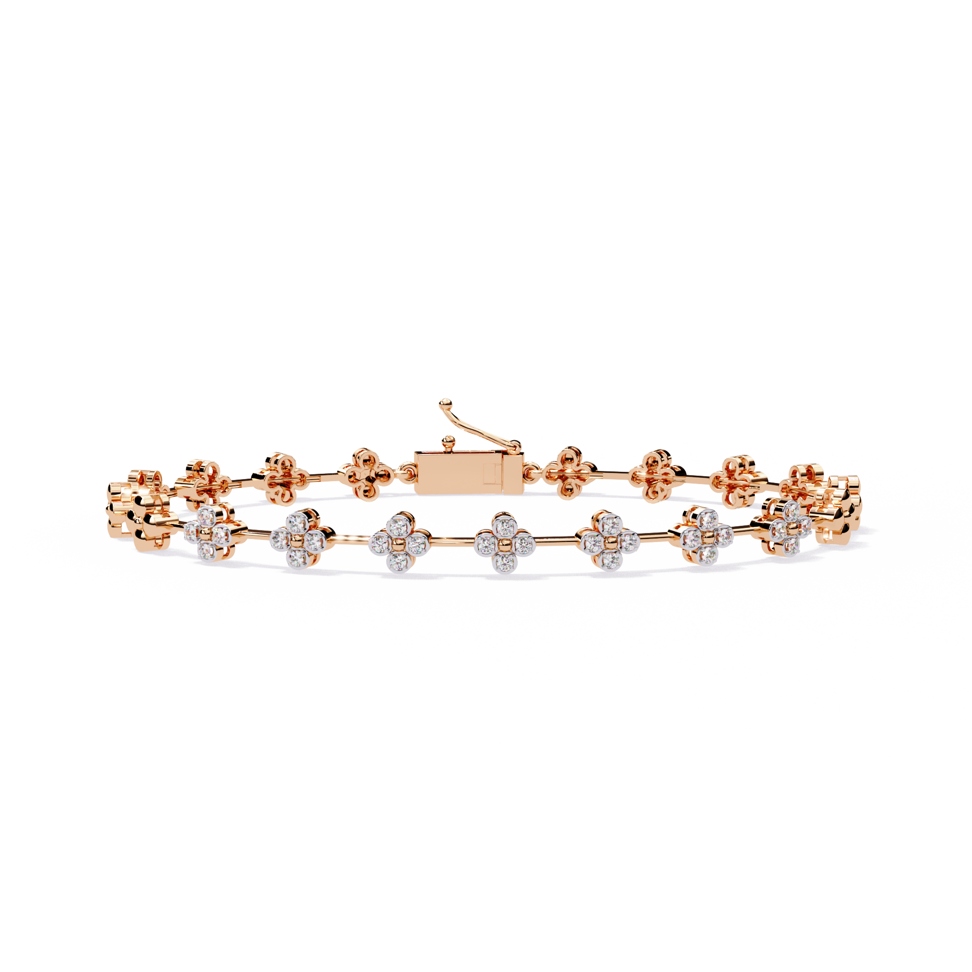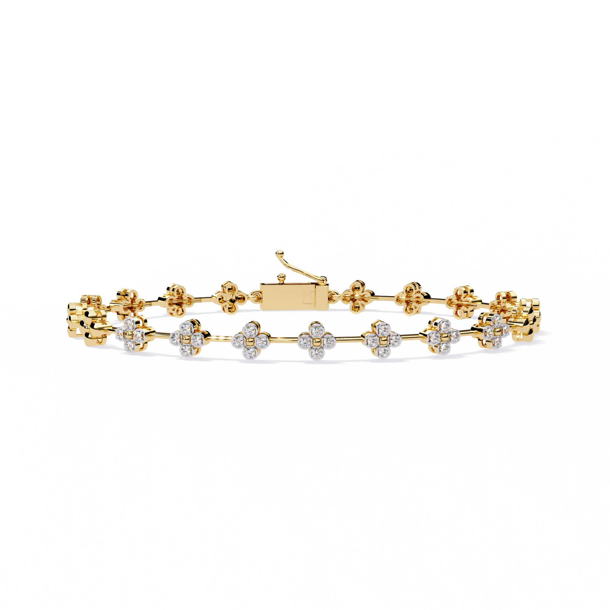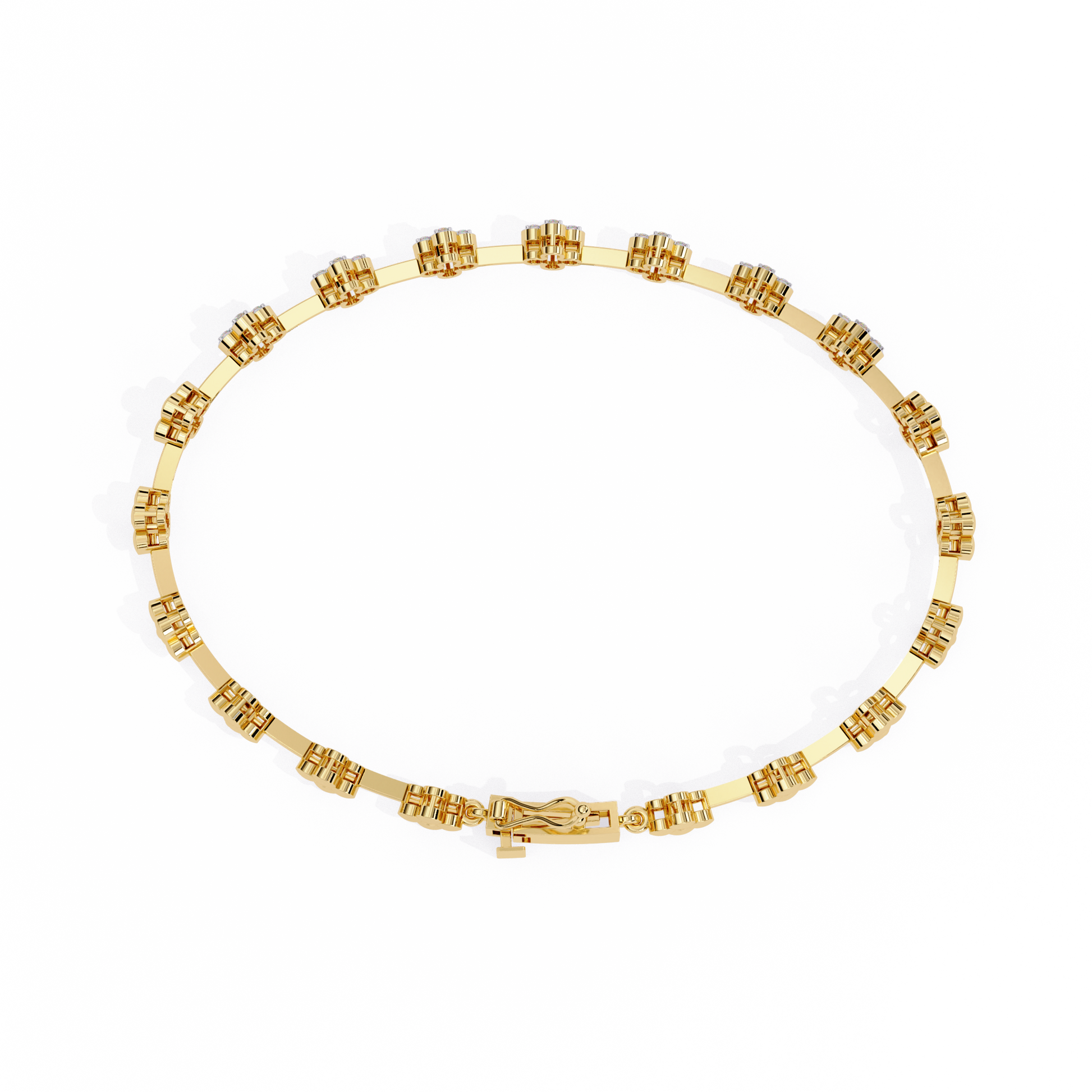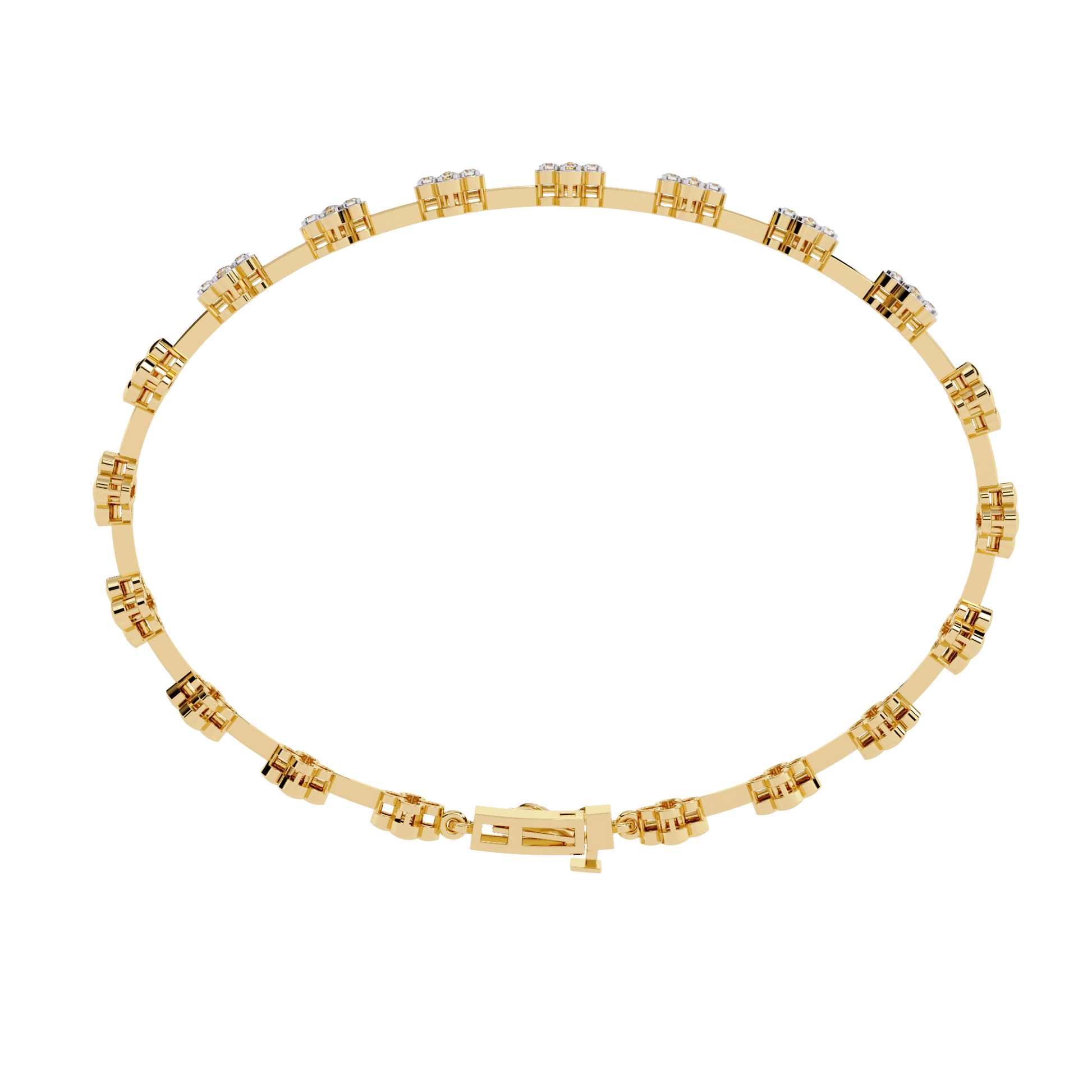 This charming bracelet features a delicate row of sculpted floral motifs, each centered with a round brilliant diamond. The dainty 7-inch gold structure balances modern elegance with timeless whimsy, secured by a classic clasp. Ideal as a sweet gift or a layering piece for everyday luxury, this design brings soft femininity and sparkle to the wrist.