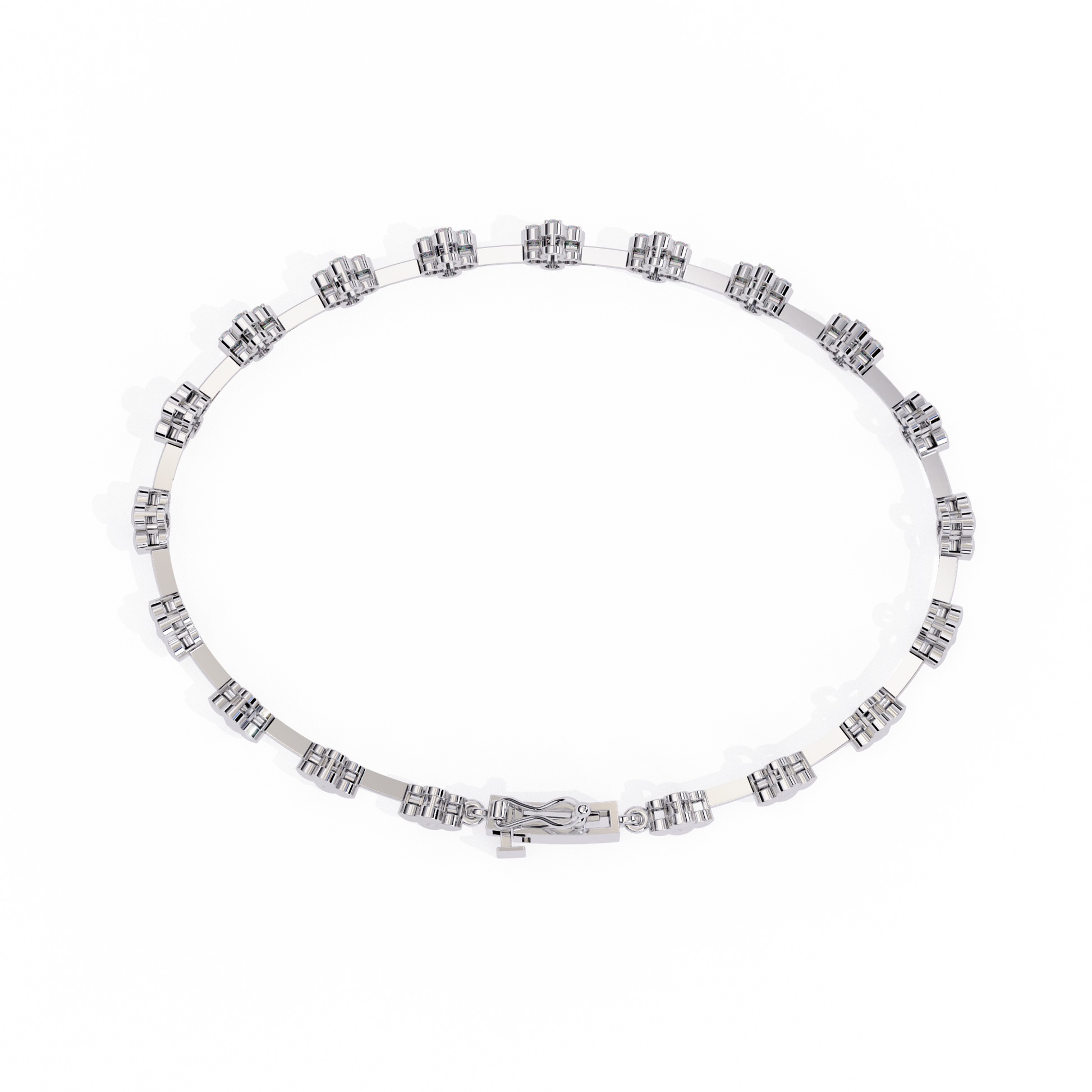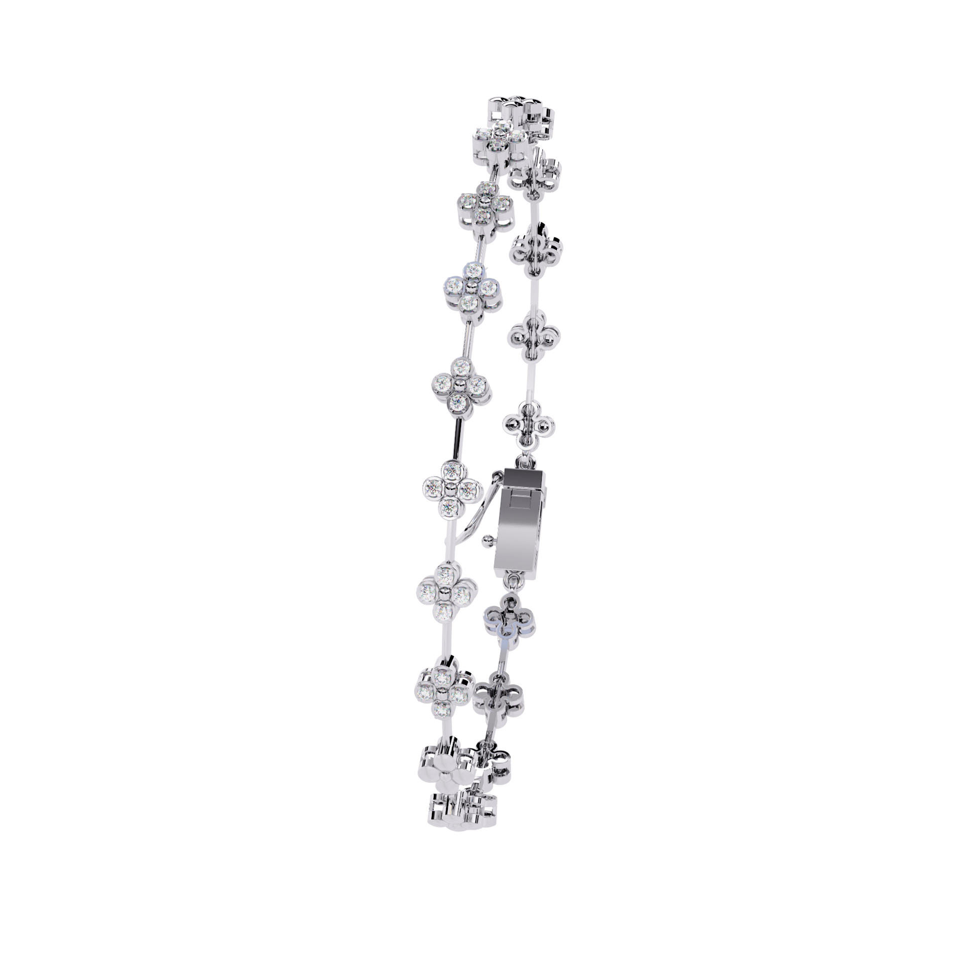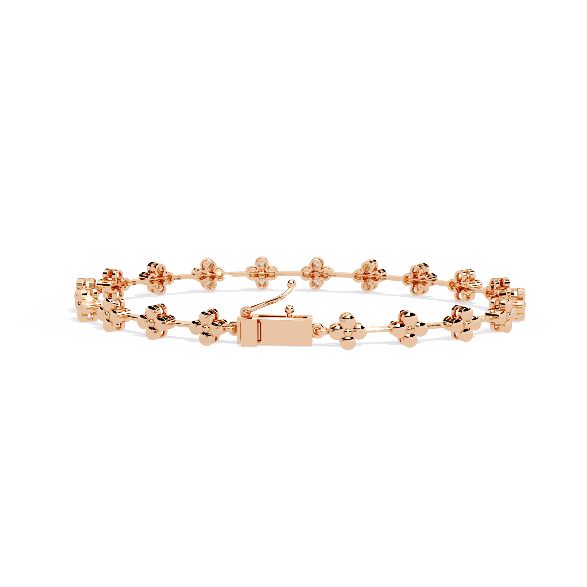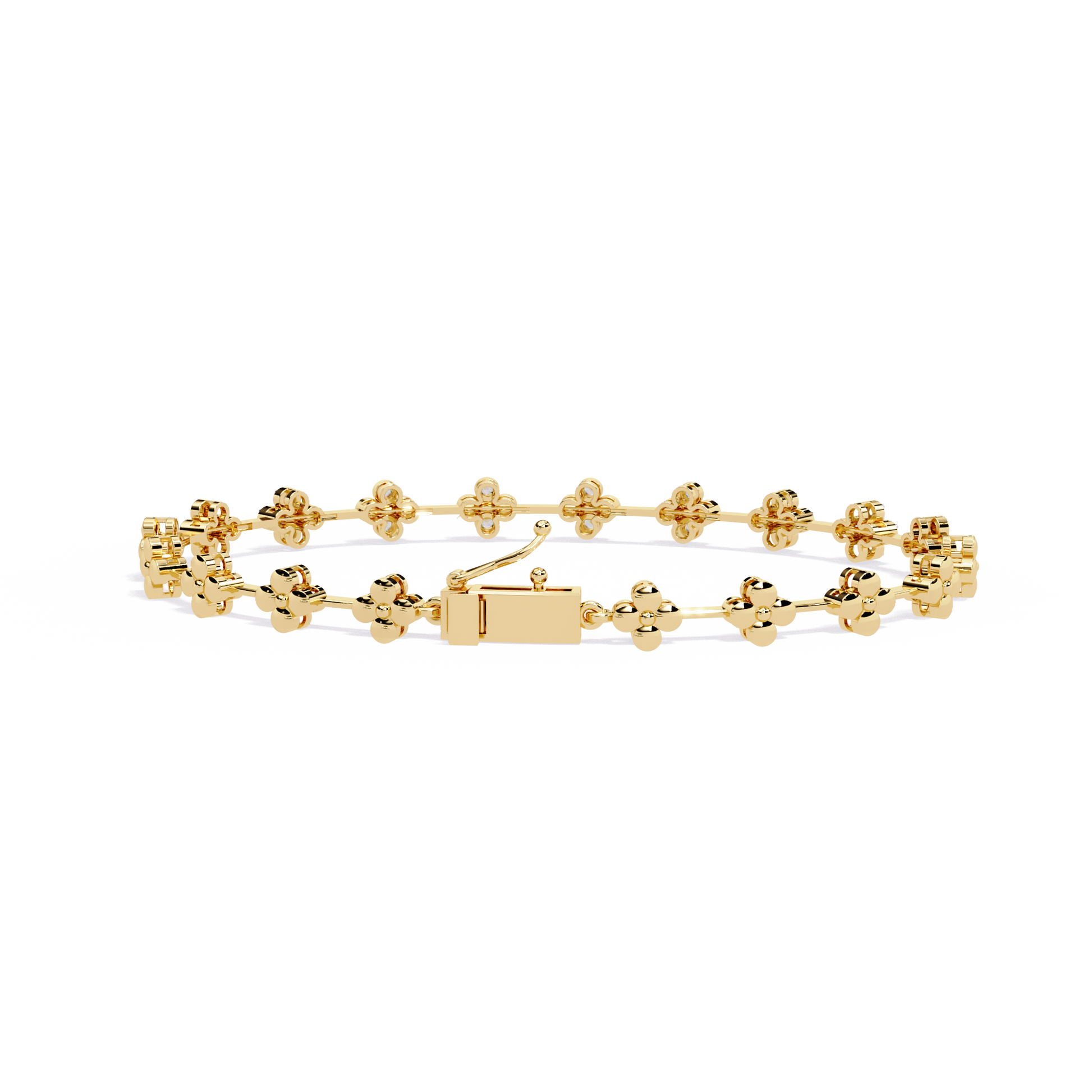 This charming bracelet features a delicate row of sculpted floral motifs, each centered with a round brilliant diamond. The dainty 7-inch gold structure balances modern elegance with timeless whimsy, secured by a classic clasp. Ideal as a sweet gift or a layering piece for everyday luxury, this design brings soft femininity and sparkle to the wrist.