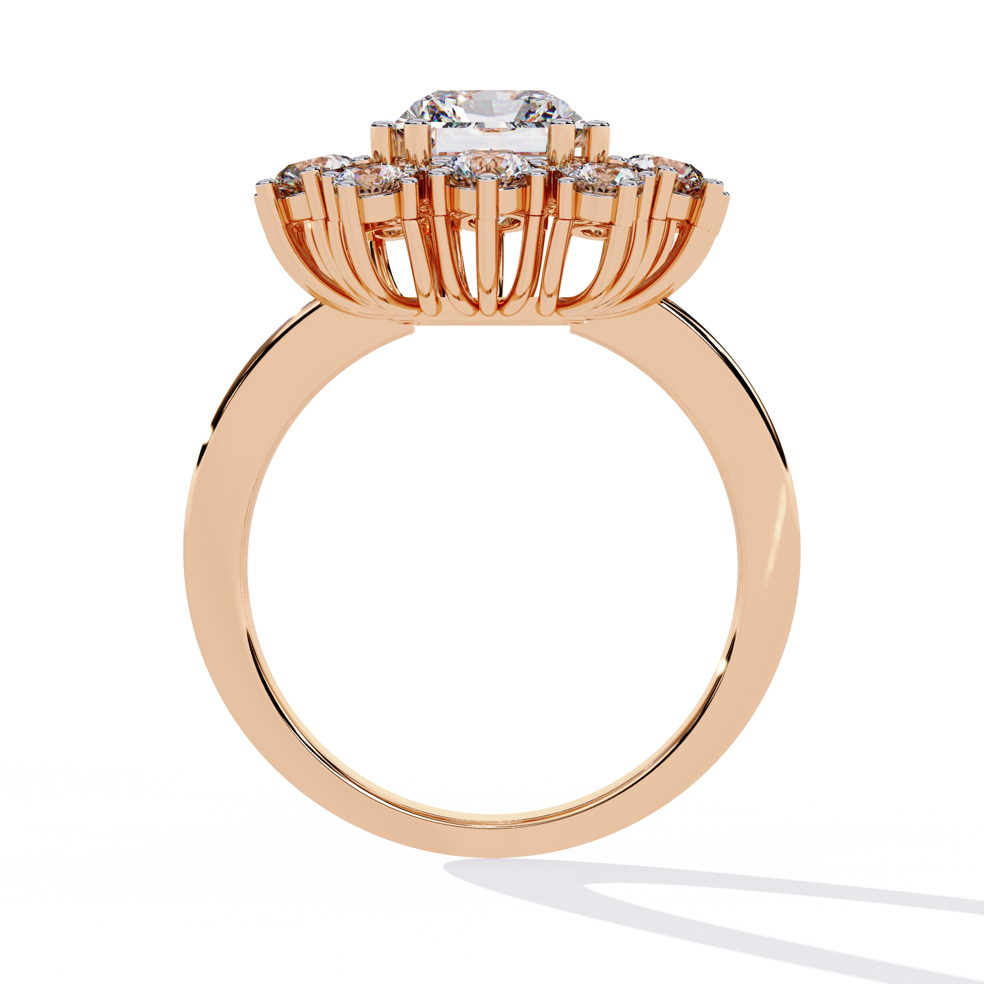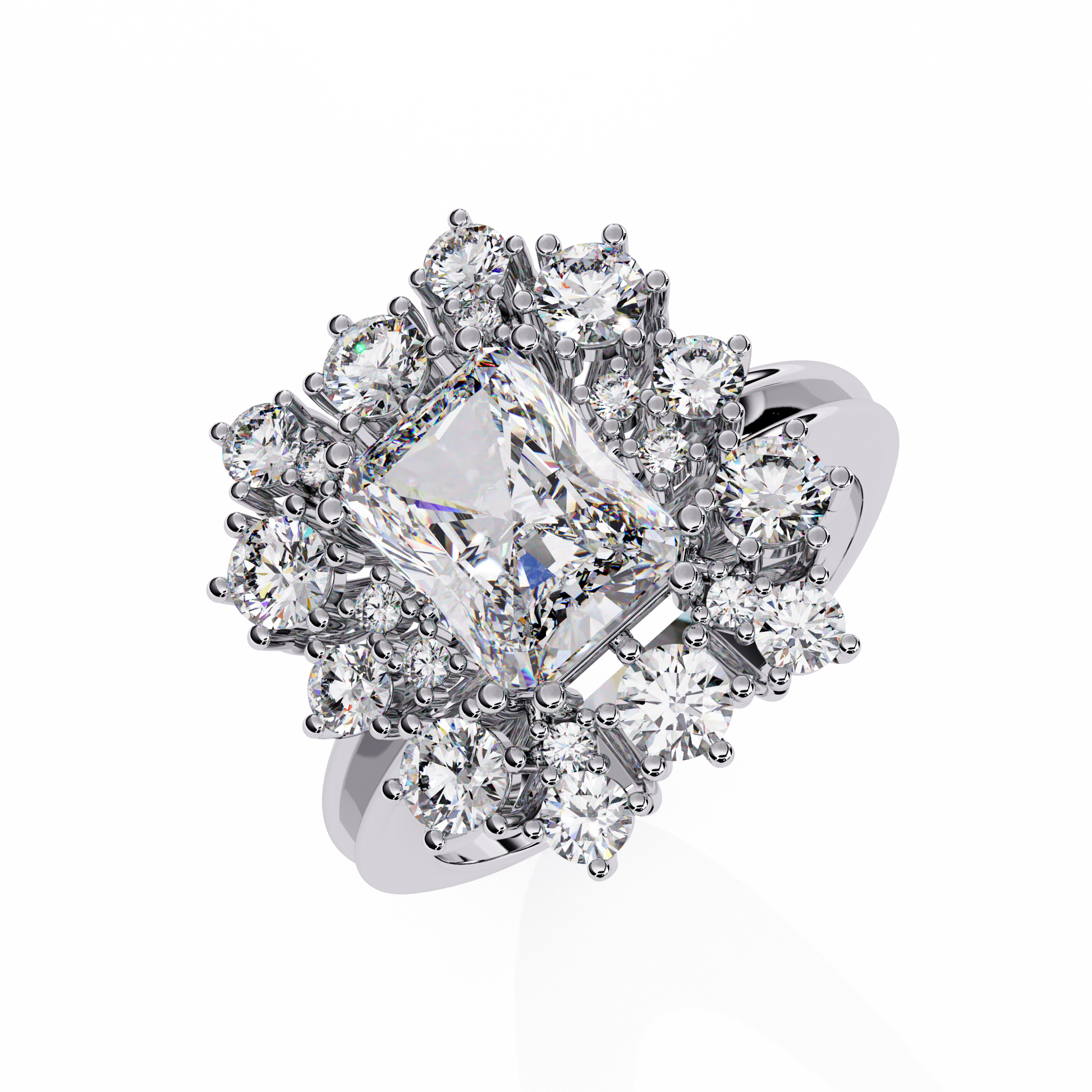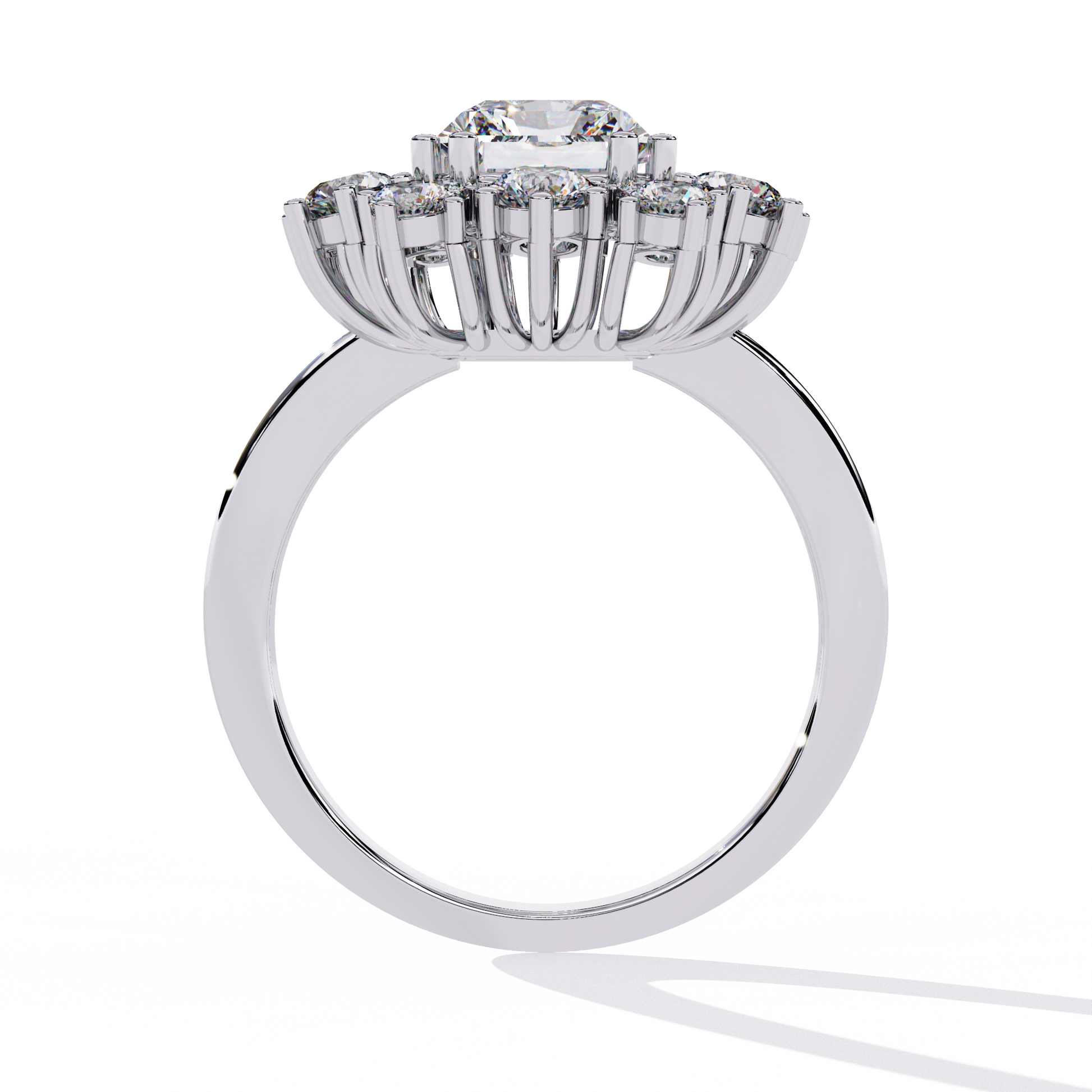 The Gala Radiance ring is a bold celebration of brilliance. Featuring a 9x7 mm radiant-cut lab-grown diamond at its center, the design is amplified by a burst of round-cut diamonds radiating outward in a dramatic floral sunburst. The structured basket setting provides strength and symmetry, holding the arrangement with refined elevation.