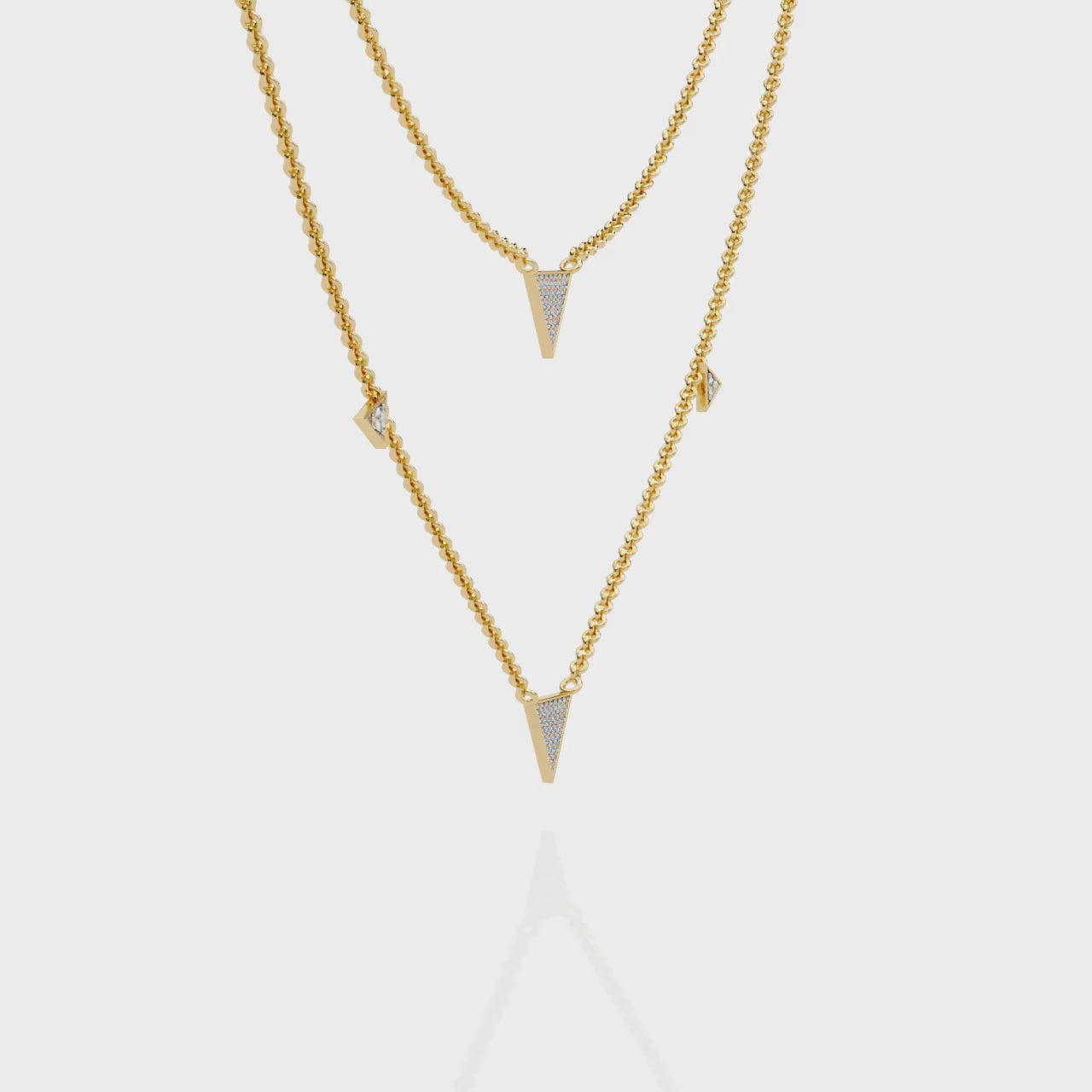 A bold yet elegant layered necklace featuring three pavé-set triangle charms. With 58 round lab-grown diamonds arranged in a geometric pattern, this double-chain design merges clean symmetry with a striking minimalist flair—perfect for contemporary styling.
