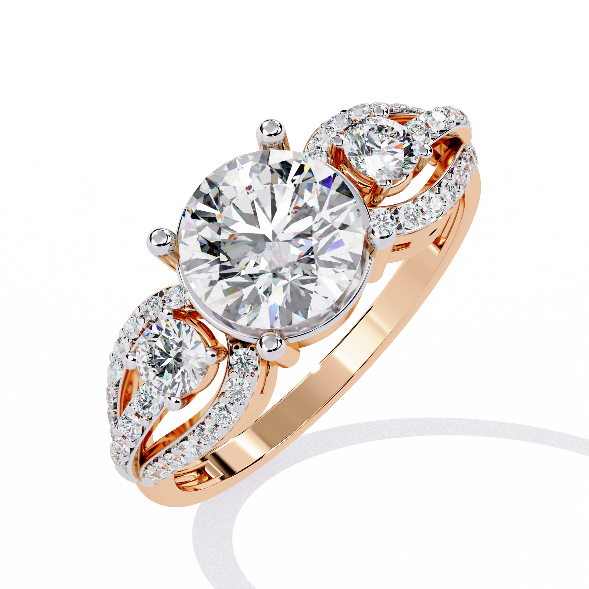 The Heirloom Trinity ring embodies timeless sophistication with its stunning three-stone composition. A 7 mm round lab-grown diamond (1.25 carats) forms the centerpiece, flanked by two 3 mm accent diamonds. Intricately haloed and framed with 39 additional pavé-set diamonds, the design radiates vintage charm with modern precision.
