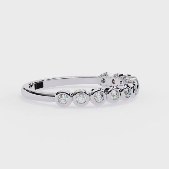 The Horizon Gleam ring features a clean V-shaped chevron silhouette adorned with eleven round lab-grown diamonds. Perfectly contoured for pairing with solitaires or worn solo as a modern classic, this piece brings balance, sparkle, and structure to any stack.