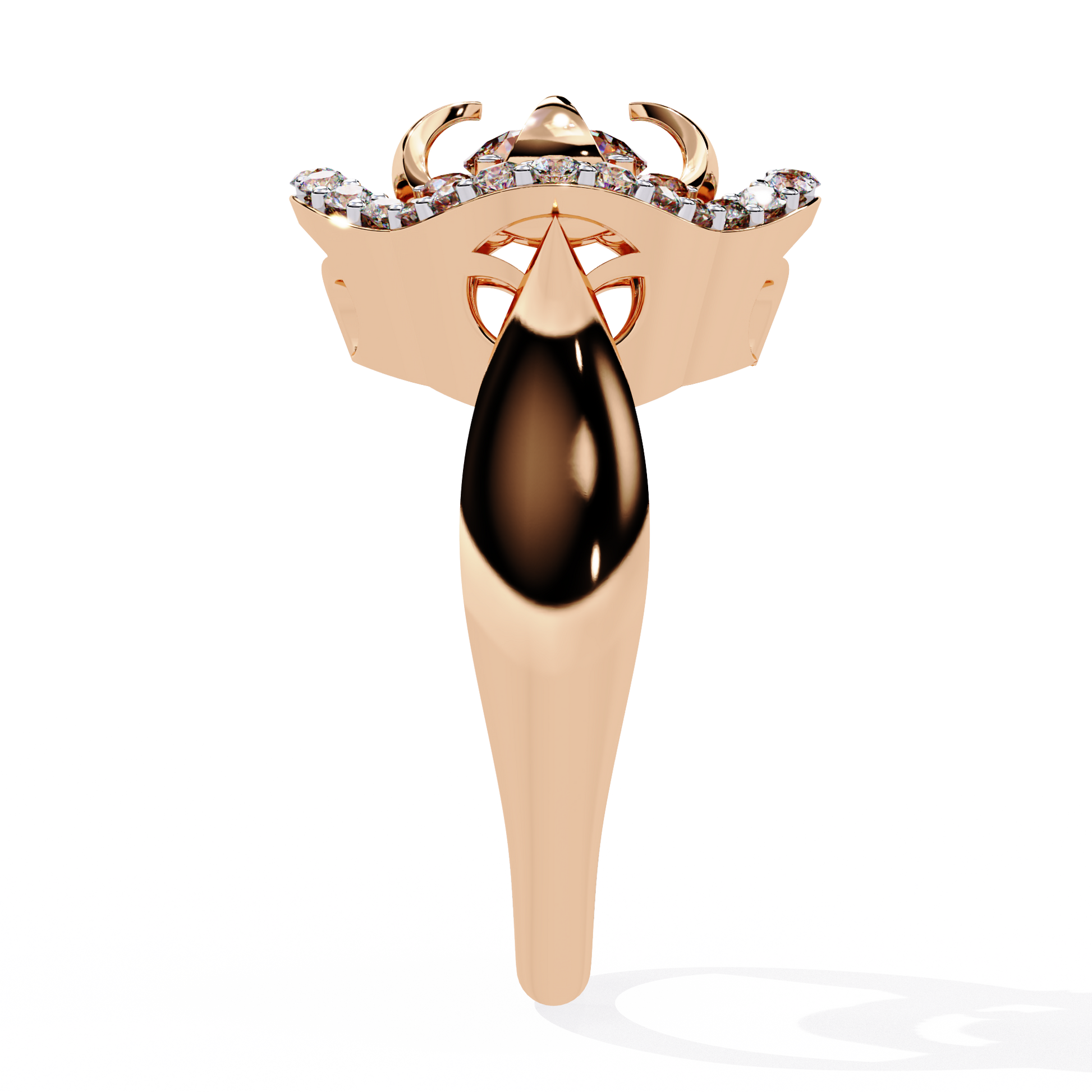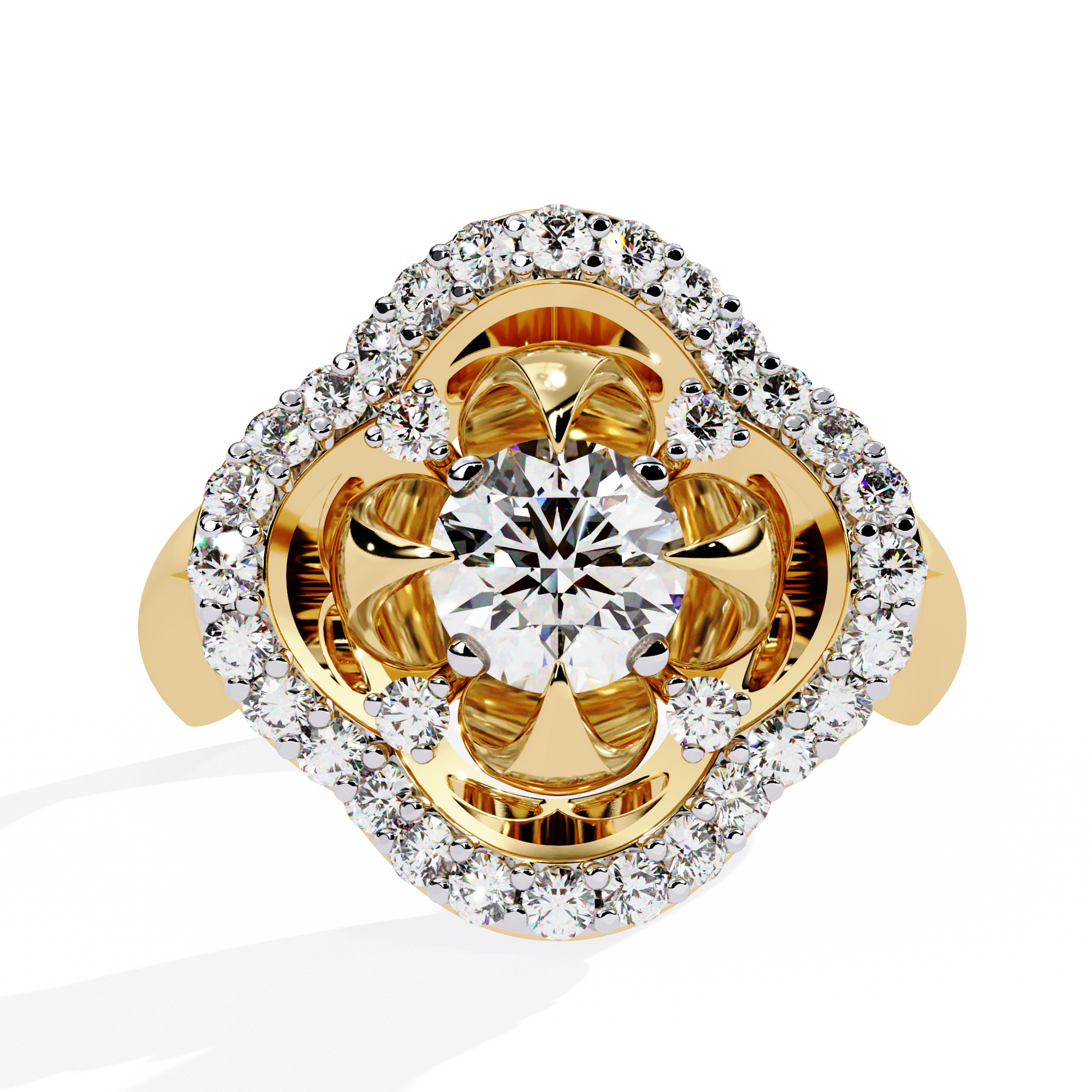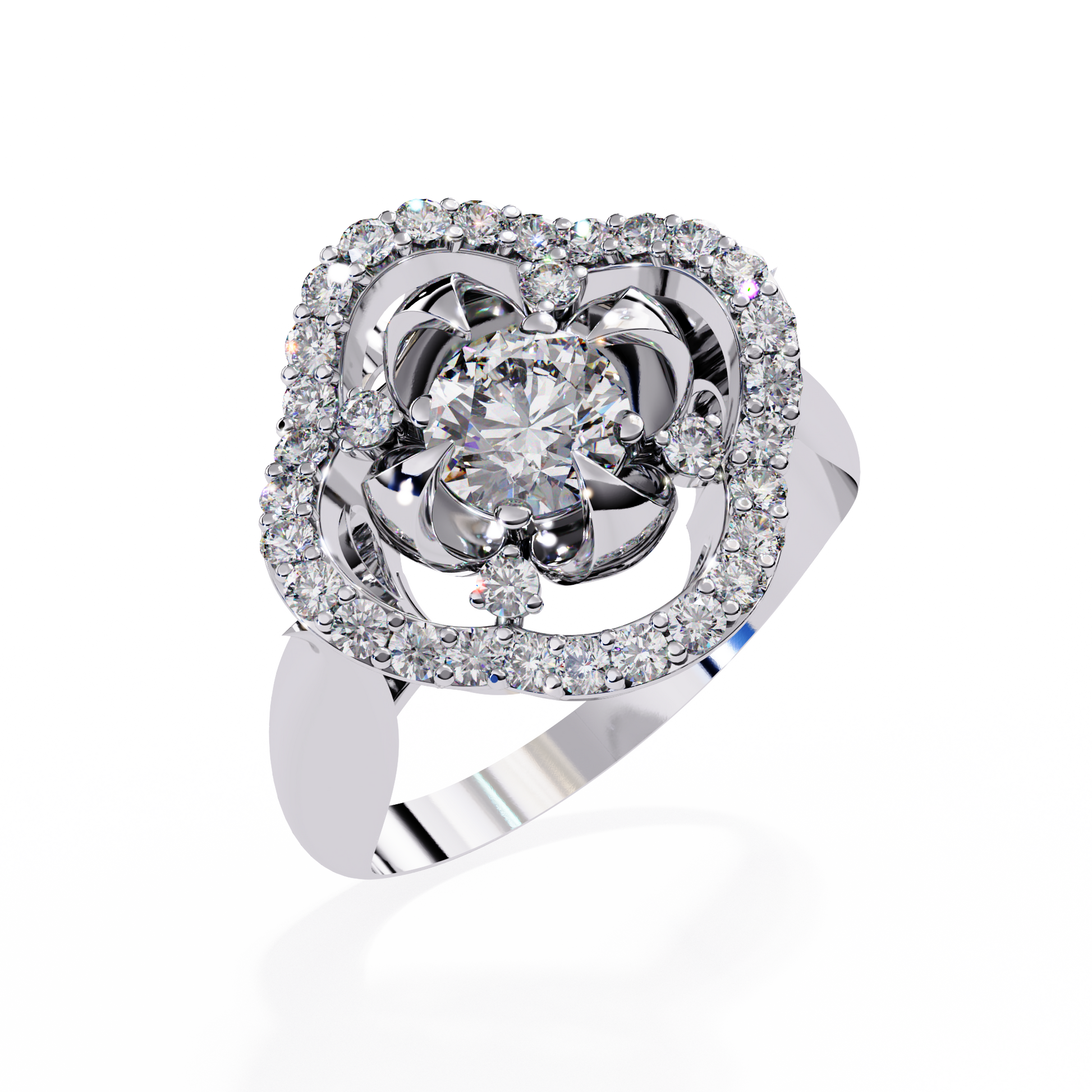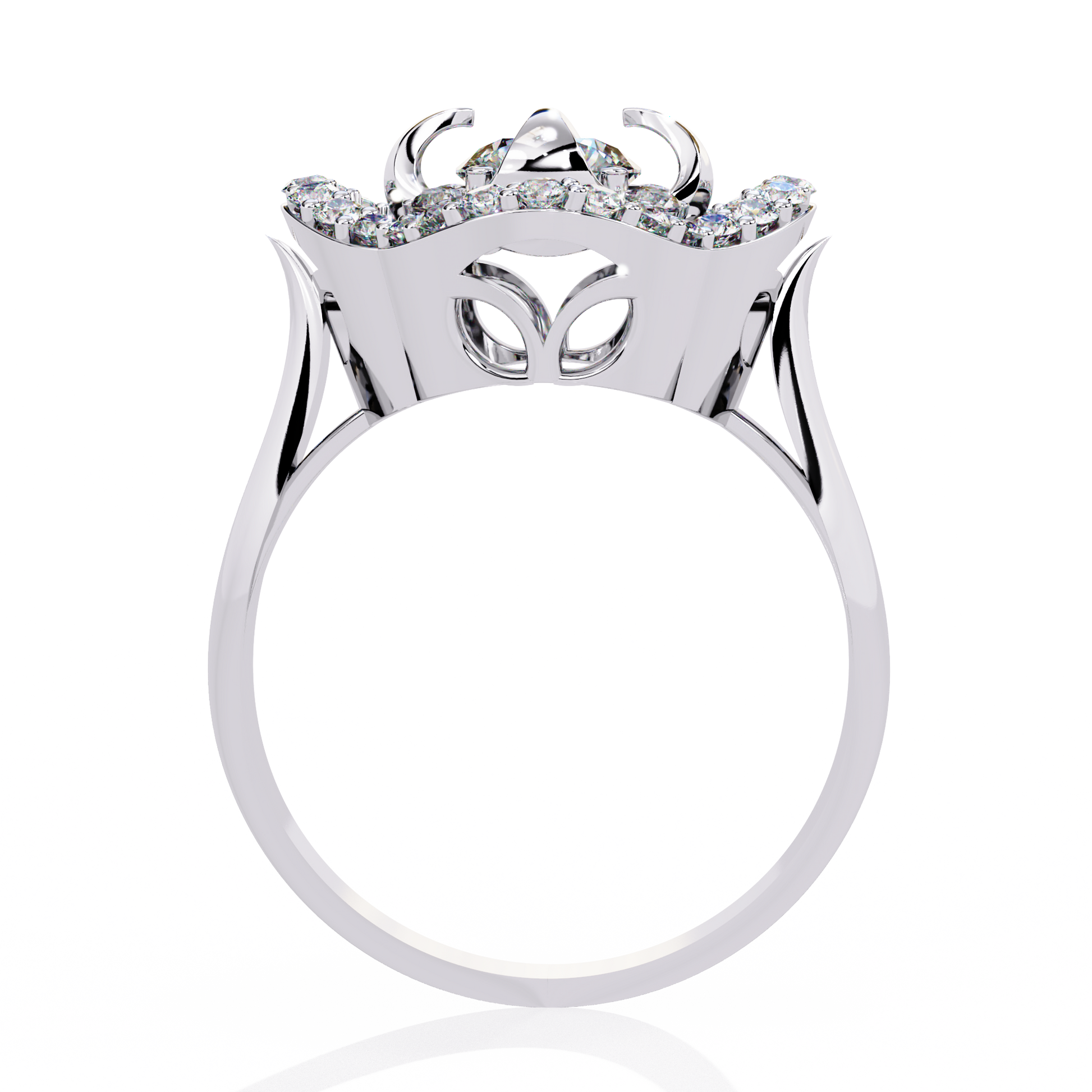 The Imperial Bloom ring blends floral beauty with regal architecture. A 5 mm round lab-grown diamond sits at the heart of an intricate petal-inspired basket, surrounded by a gleaming halo of 32 smaller diamonds. With its elevated shank and sculpted crown-style gallery, this piece embodies both elegance and grandeur.