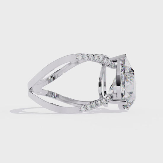The Infinite Grace ring features a striking 13 × 8 mm pear-cut lab-grown diamond set at the center of a bold, split criss-cross shank. With pavé accents lining each curve, this sculptural design radiates confidence and fluidity.