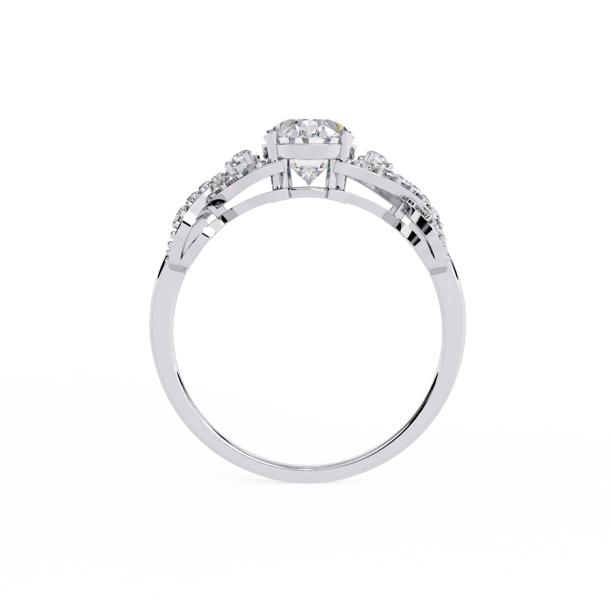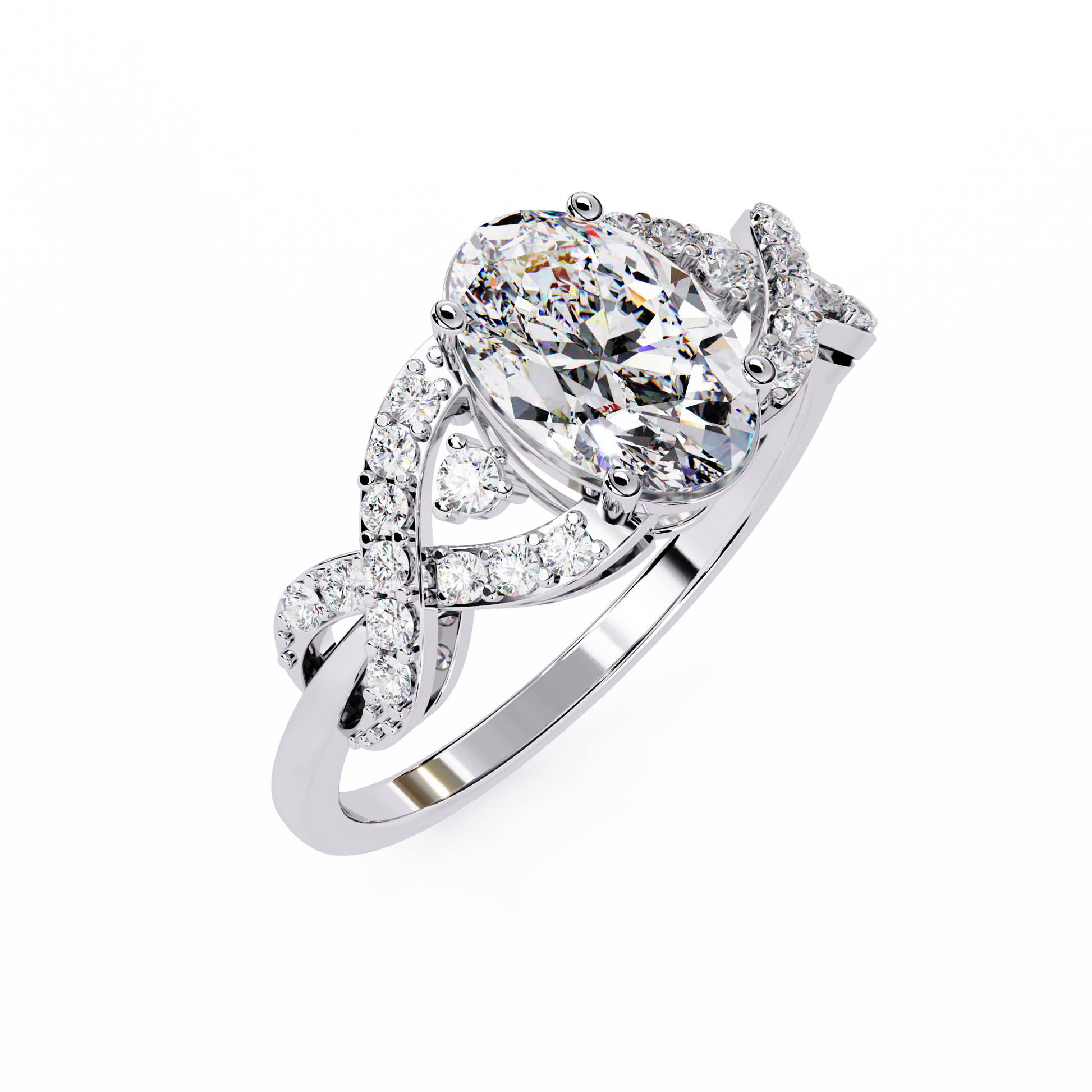 The Infinity Crown ring features a 9x7 mm oval lab-grown diamond cradled in a sculptural twist of pave-set ribbons. The intertwined shank creates the illusion of flowing motion, making this ring both romantic and refined.