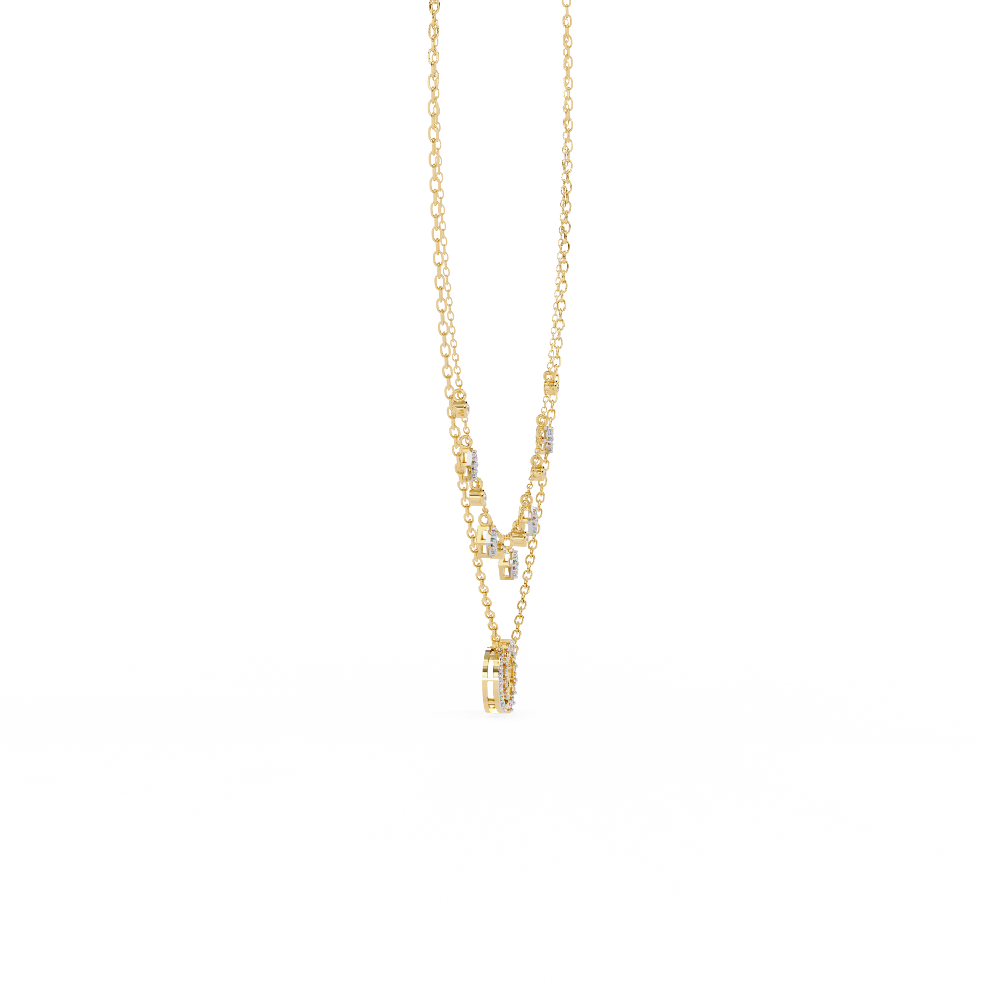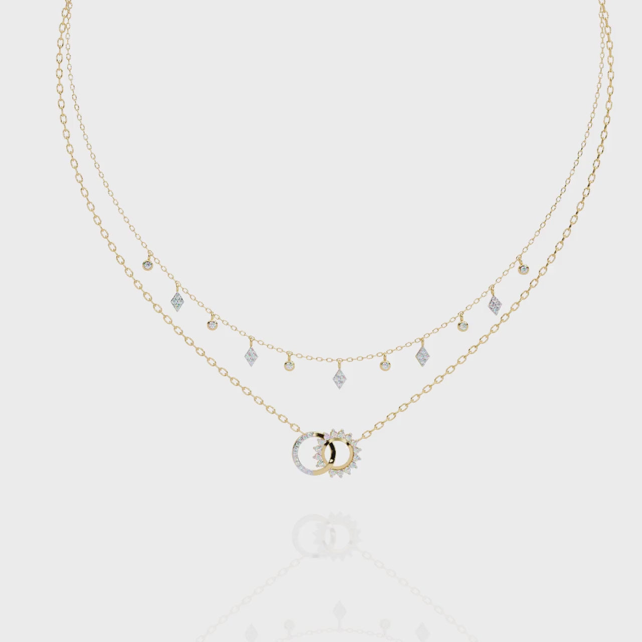 This celestial-inspired necklace features two shimmering diamond-encrusted rings suspended on a dual-layer chain, accented by petite geometric charms. The playful yet refined design brings together cosmic motifs and fine craftsmanship, making it a standout everyday piece in 14K gold.