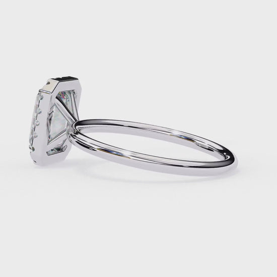 The Radiant Duality ring features a radiant-cut lab-grown diamond accented by round stones arranged in a split, twinned band. The interplay of brilliance and structure creates a modern, dimensional profile with bold sophistication.
