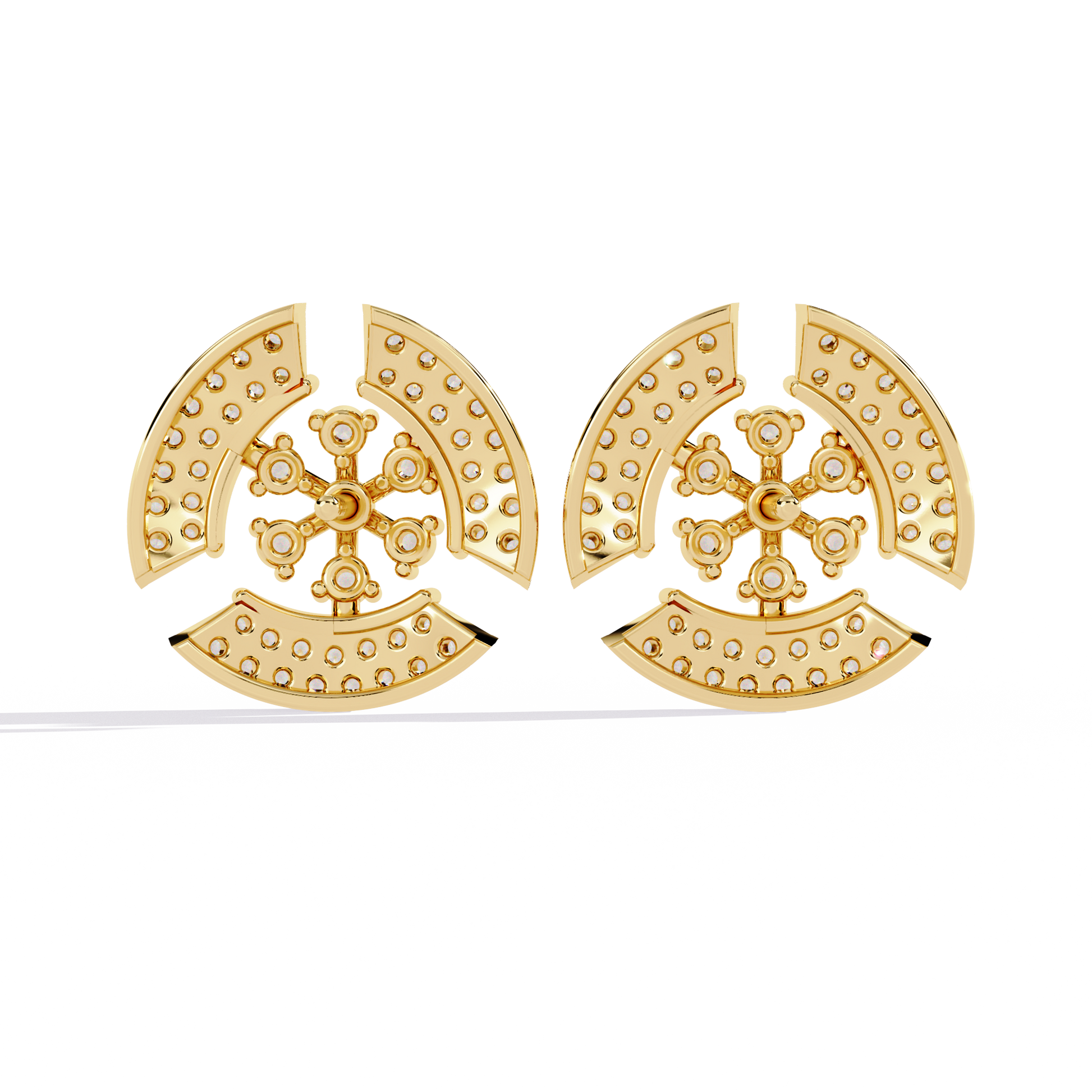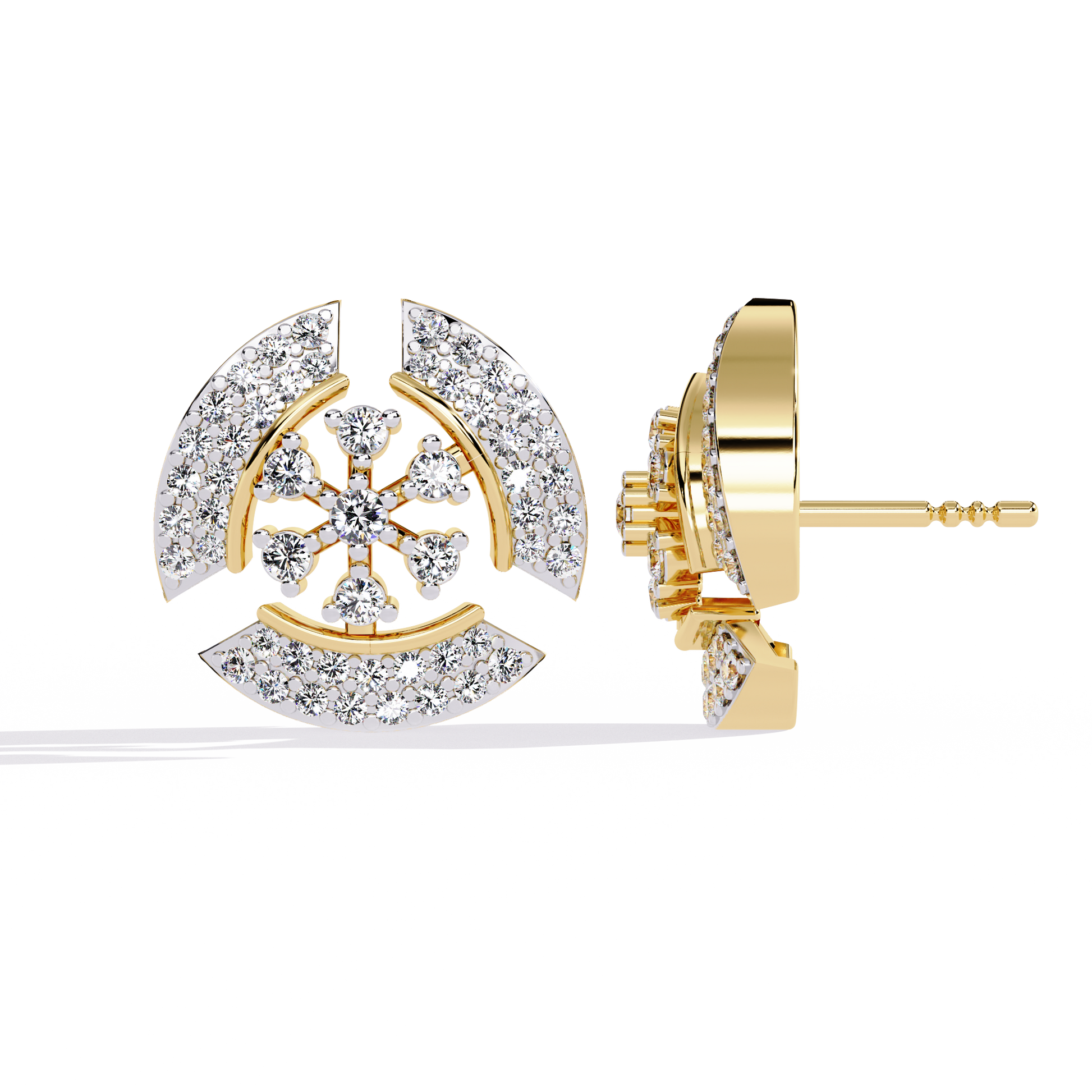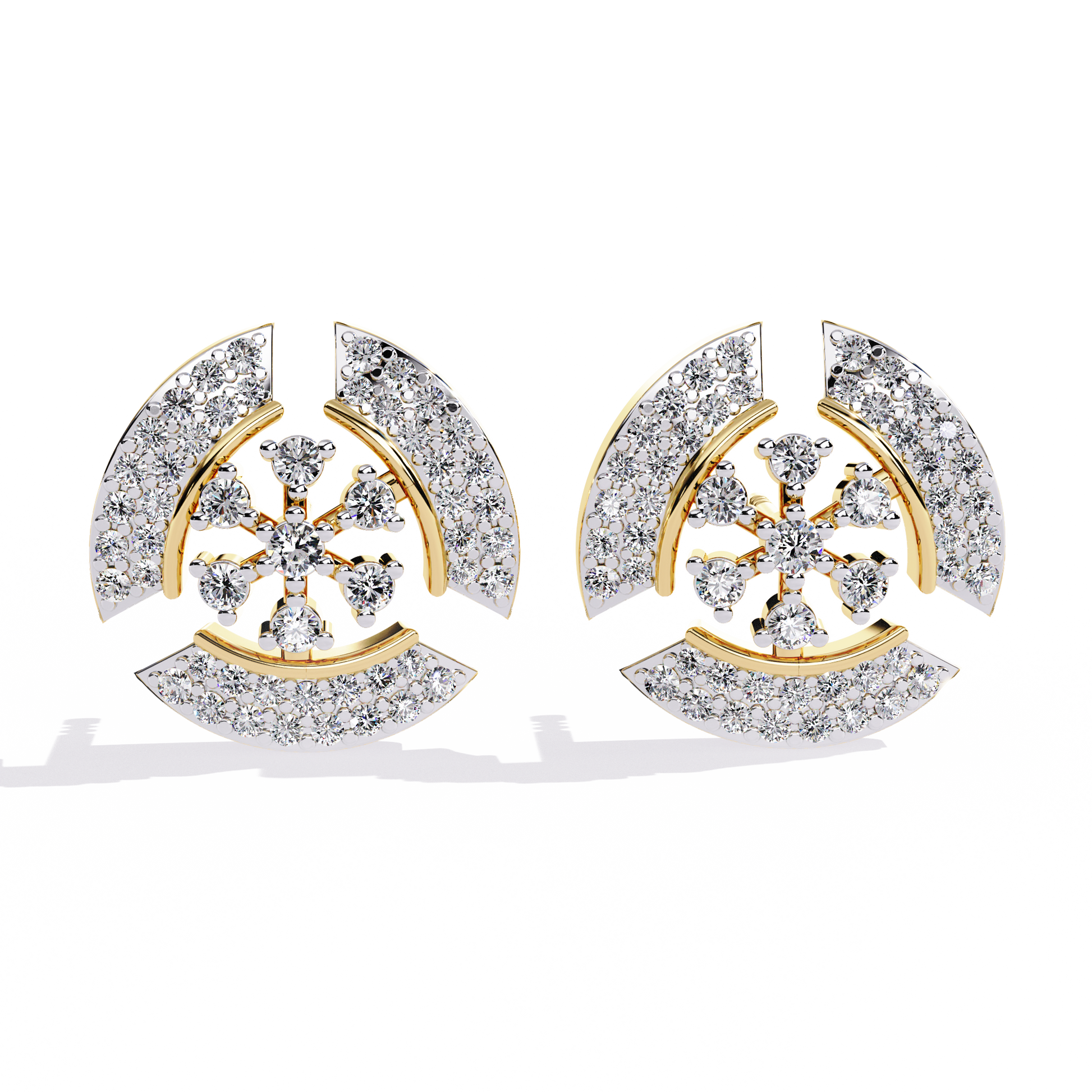 The Radiant Halo earrings are crafted in 14K gold, showcasing a bold semi-crescent design divided by a radiant diamond flower centerpiece. Meticulously pavé-set with 104 round lab-grown diamonds of various sizes, these 12.5 mm studs radiate brilliance from every angle. A sculptural yet balanced design, perfect for adding structured elegance to everyday and evening wear.