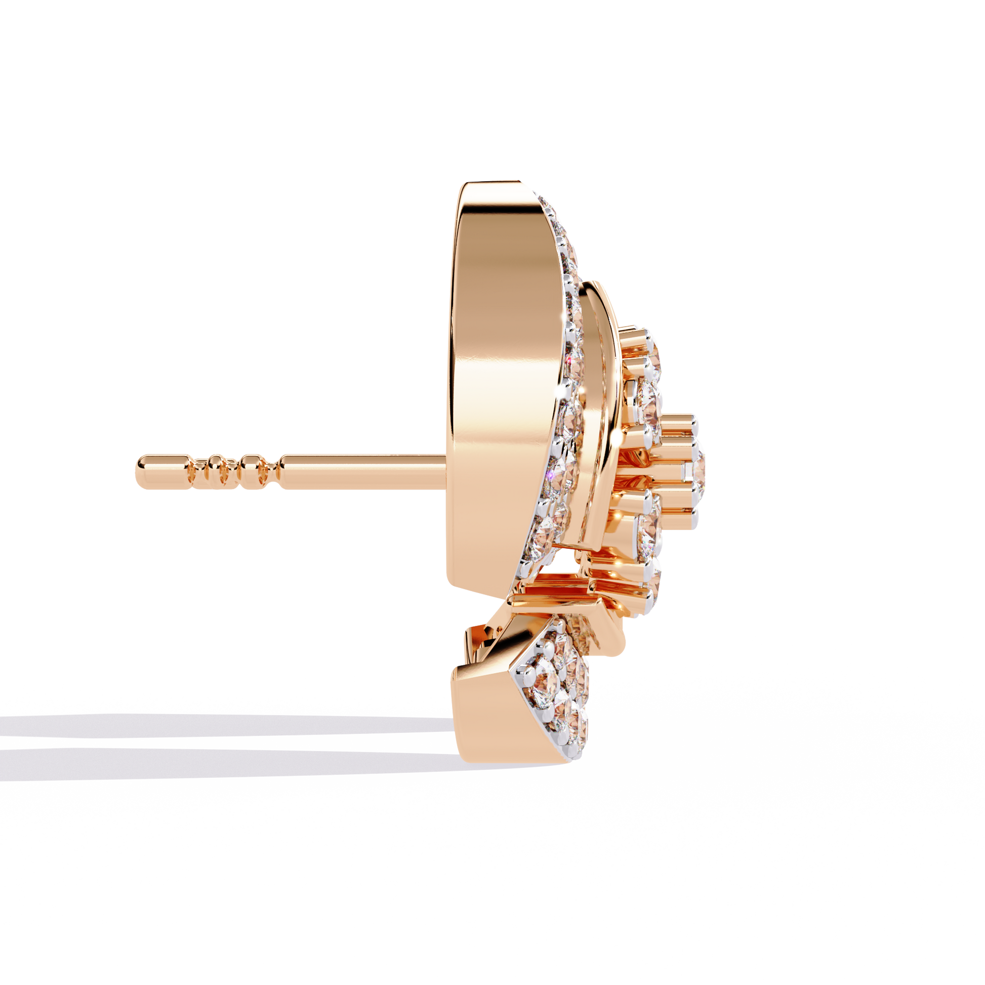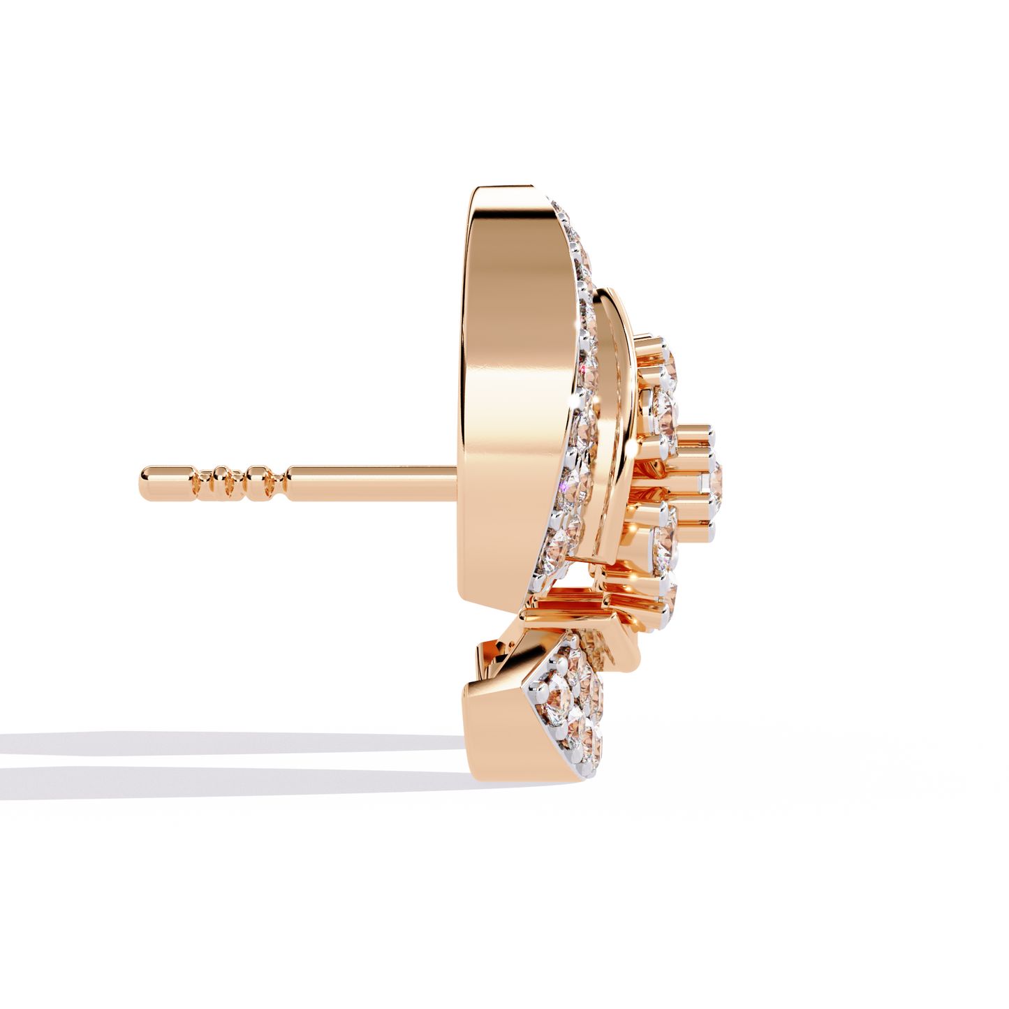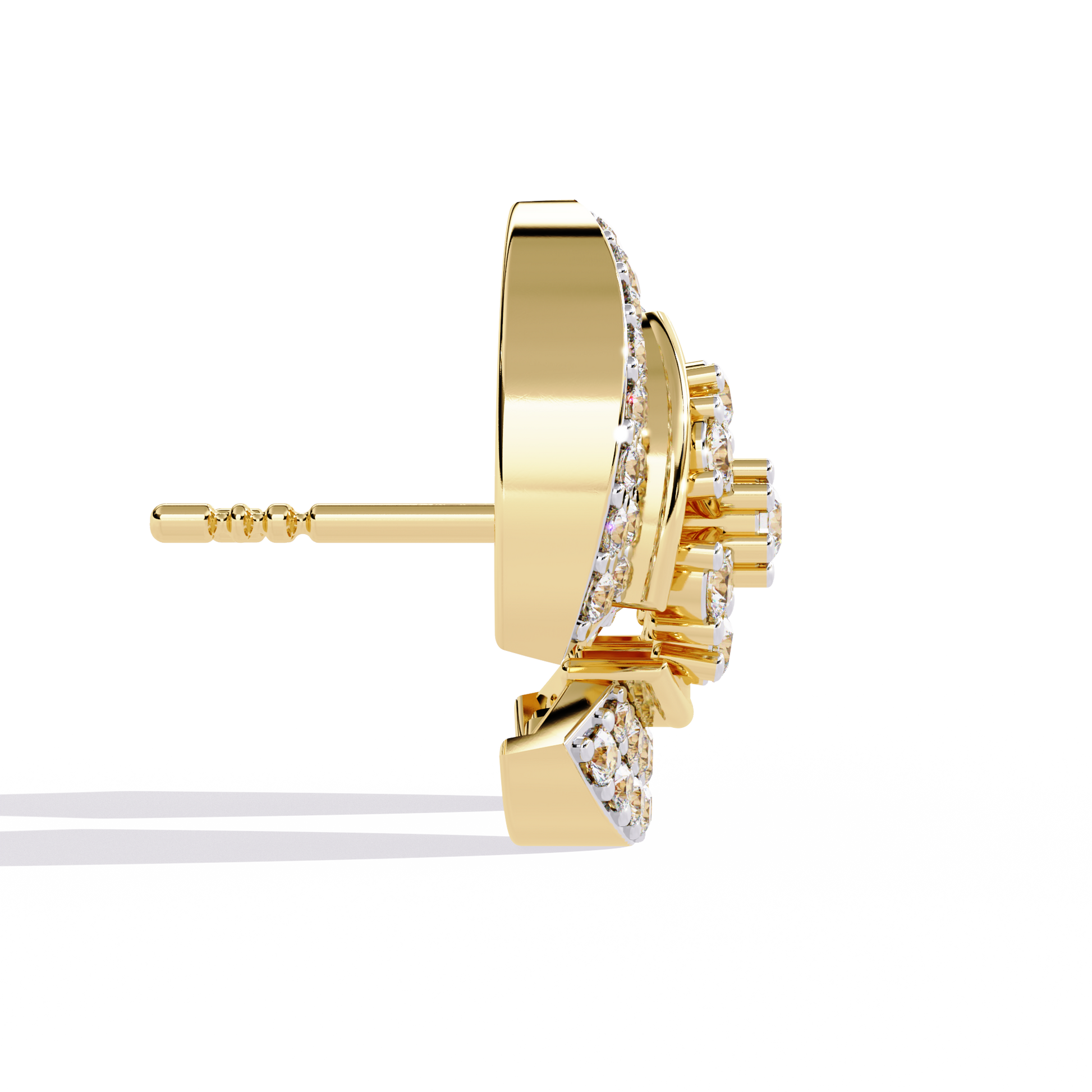 The Radiant Halo earrings are crafted in 14K gold, showcasing a bold semi-crescent design divided by a radiant diamond flower centerpiece. Meticulously pavé-set with 104 round lab-grown diamonds of various sizes, these 12.5 mm studs radiate brilliance from every angle. A sculptural yet balanced design, perfect for adding structured elegance to everyday and evening wear.