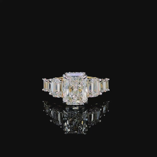 A fusion of regality and architectural symmetry, the Regal Tiered ring features a striking composition of vivid emerald-cut green gemstones paired with a band of round lab-grown diamonds. The stepped shank and bold elevation accentuate the central emerald's grandeur, while the white gold base enhances each facet's glow. Perfect for collectors of rare design or as a statement anniversary gift, this piece stands at the crossroads of elegance and edge.