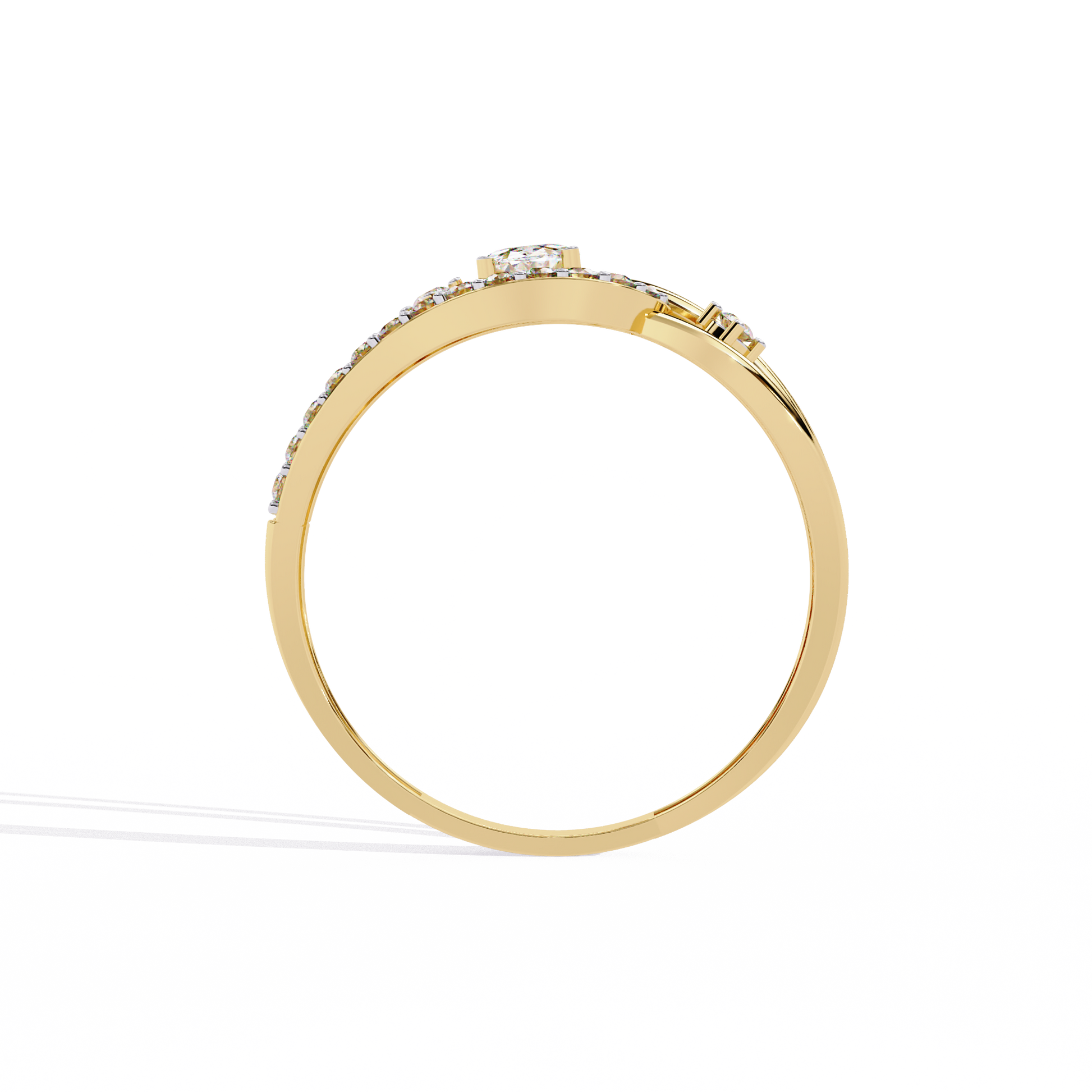 The Ribbon Wrap ring blends fluid movement with elegant structure. At its center, a 4x3 mm oval lab-grown diamond is gracefully secured within a double-band silhouette. Two strands curve around the finger in a dynamic wave, each accented by a line of round brilliant diamonds. Crafted in polished 14K gold, this piece speaks to modern sophistication with a hint of artistic flair.