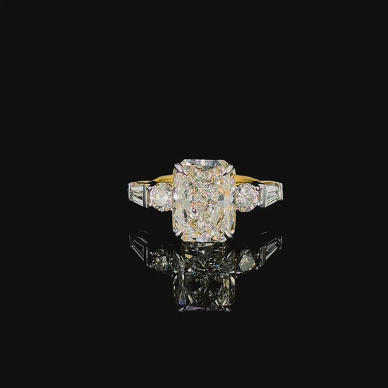 Sculpted with architectural elegance, this dual-sided masterpiece centers around a 10.0 x 8.0 mm Radiant-cut gemstone flanked by uniquely tapered marquise-cut side stones. The modern east-west layout of the marquise diamonds delivers dynamic contrast to the bold Radiant centerpiece. With split-prong settings and slender gold bands, this ring blends structure and sparkle in perfect harmony – ideal for women who embrace strength and grace in every facet of their journey.