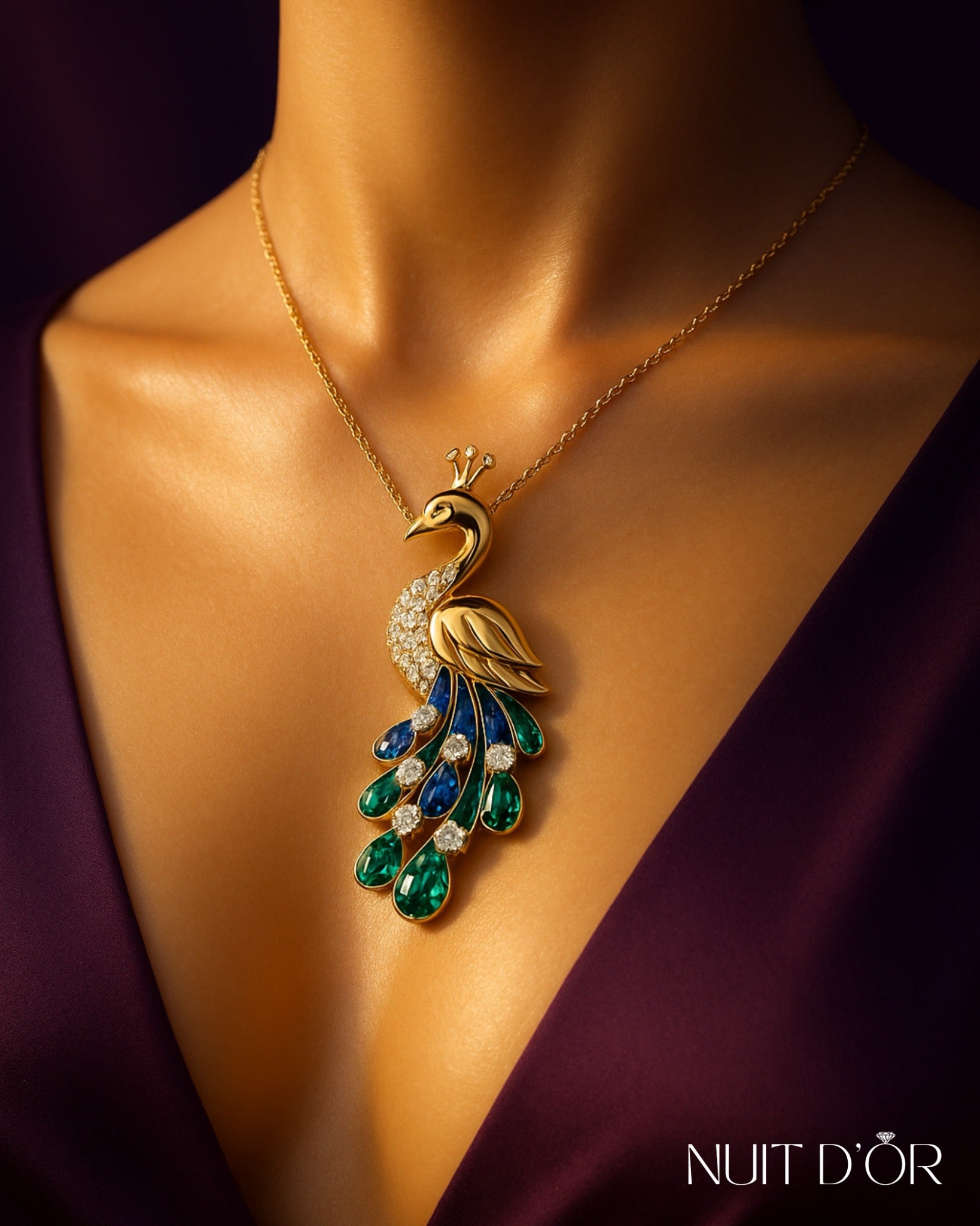 A golden peacock adorned with emeralds, sapphires, and diamonds — radiating beauty, pride, and timeless elegance