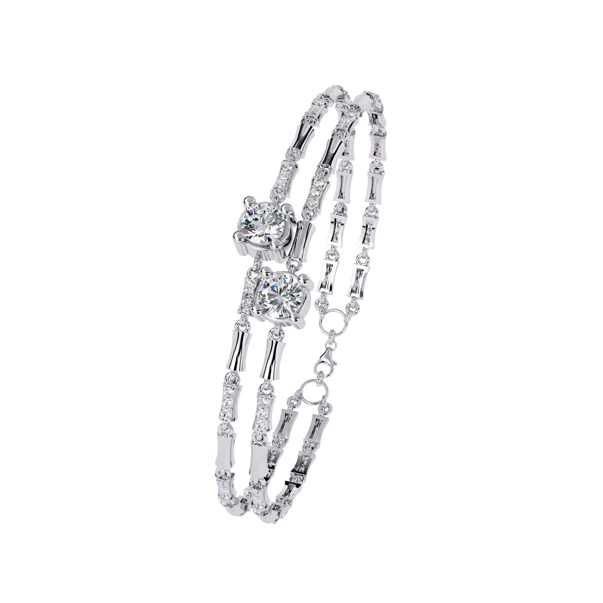The Twin Radiance bracelet redefines sophistication with its signature dual 6 mm solitaire lab-grown diamonds, totaling 1.50 carats. Set atop a double-strand bamboo-inspired gold frame and accented by a series of petite round lab diamonds, this design combines strength with striking elegance. A modern heirloom ideal for anniversaries, luxury gifts, or a refined personal collection.