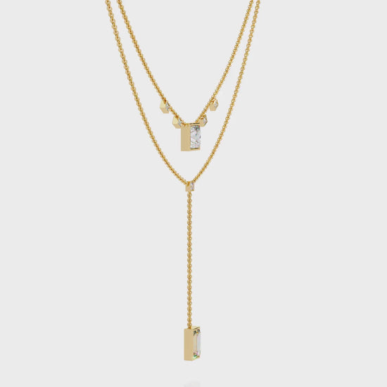 This layered lariat necklace showcases geometric brilliance with princess-cut and emerald-cut lab-grown diamonds suspended across a dual chain. With a 52mm elegant drop and refined bezel settings, it creates an elongated silhouette for a sophisticated statement.