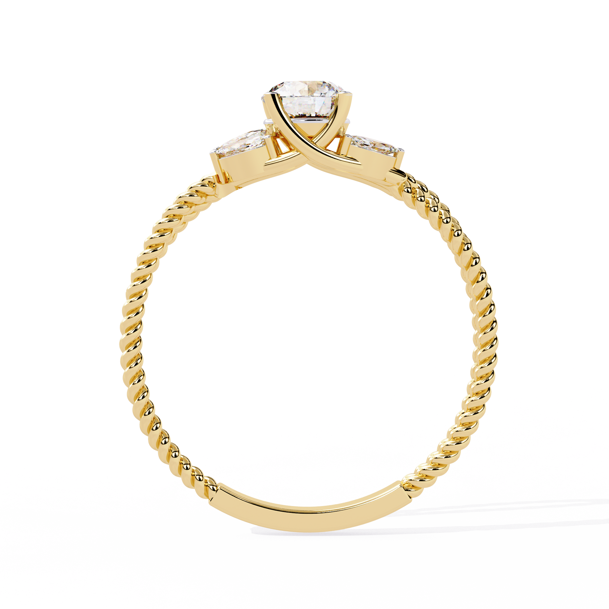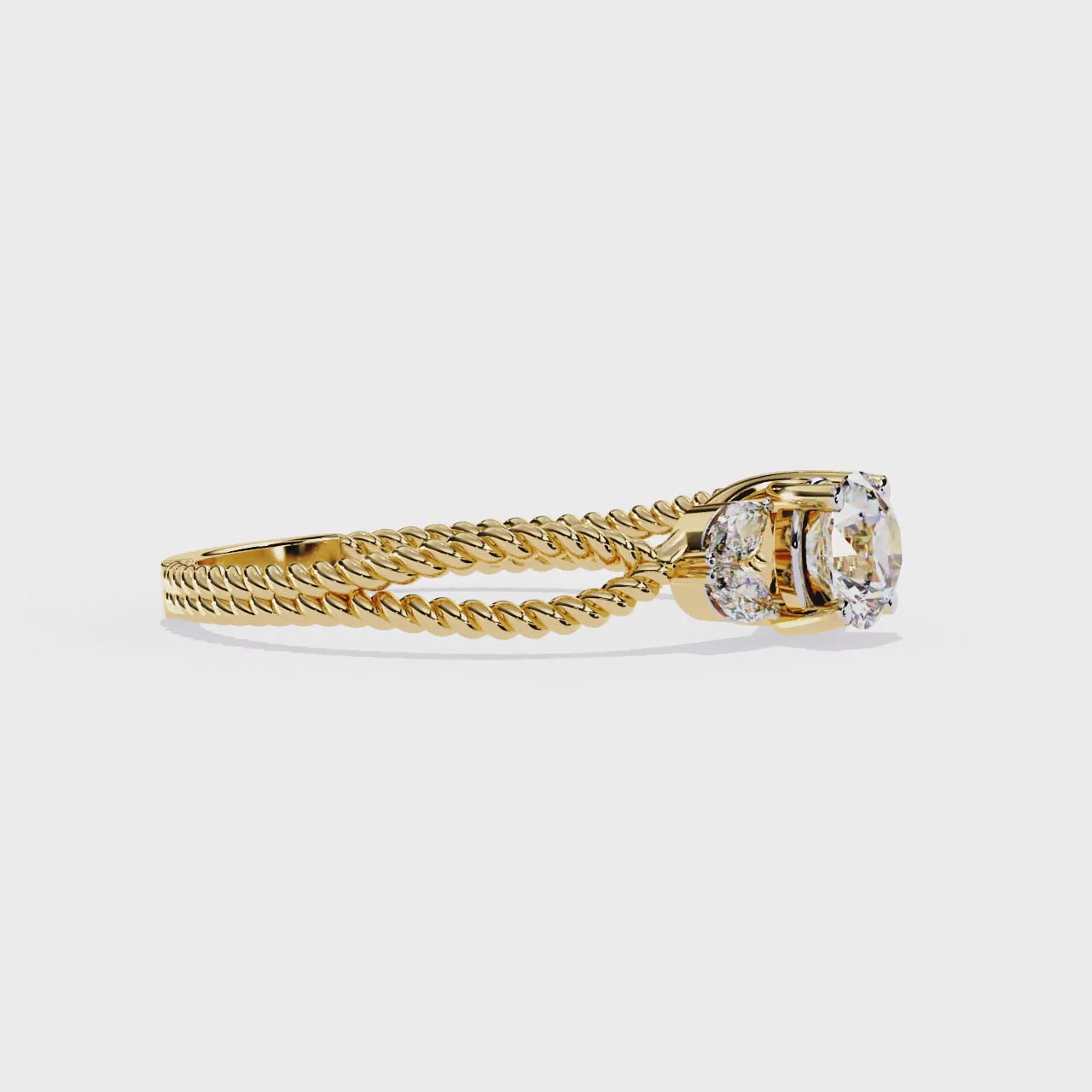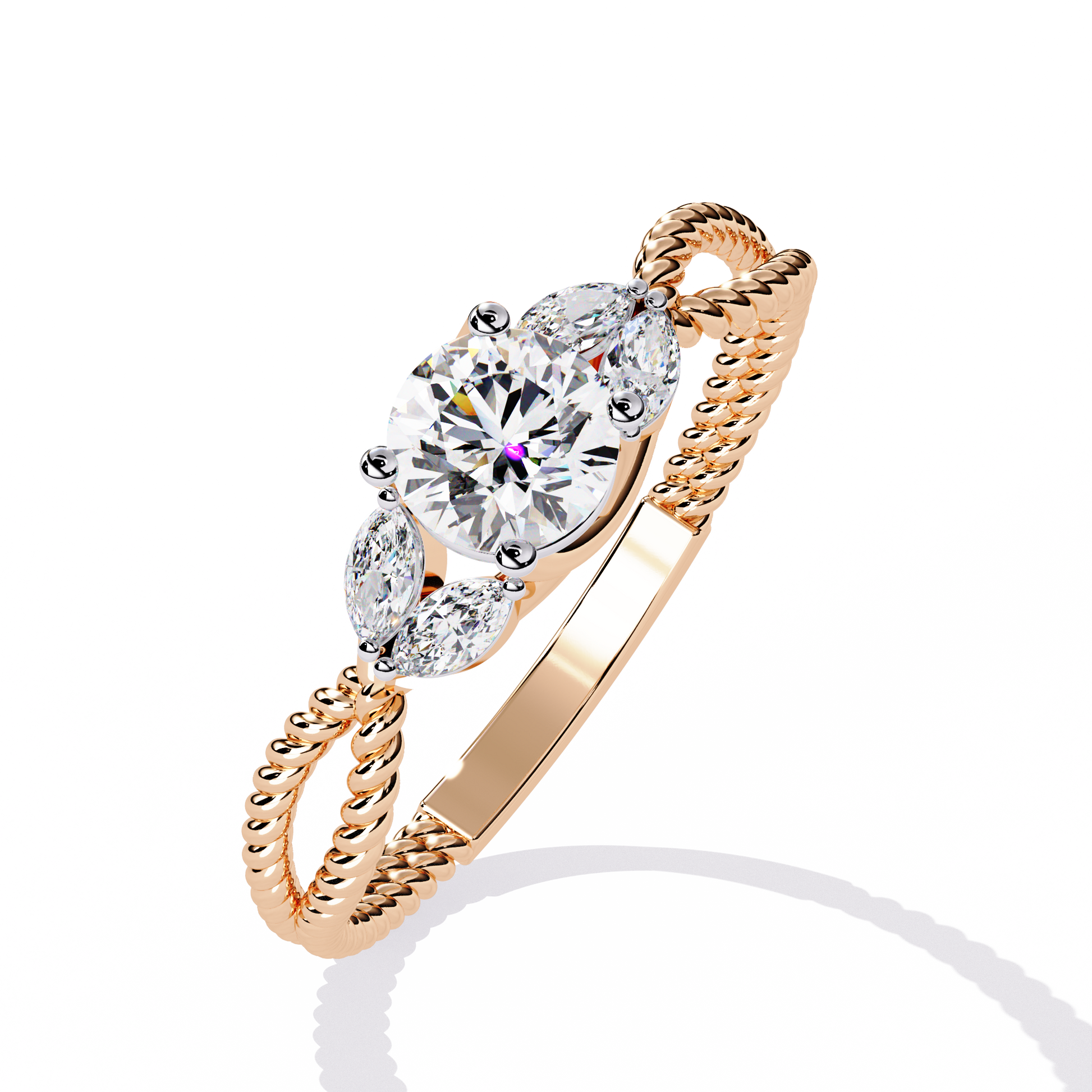 The Twist Marquise ring is a fusion of elegance and texture. A 4.5 mm round-cut lab-grown diamond takes center stage, flanked by four perfectly matched marquise diamonds. The braided gold band adds intricate depth, giving this ring an artisanal charm that sets it apart from classic silhouettes.