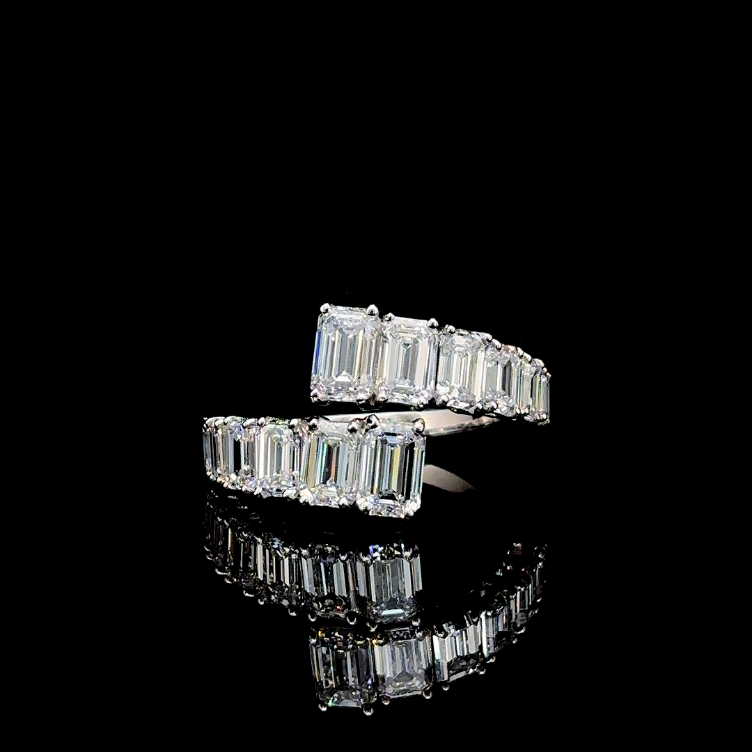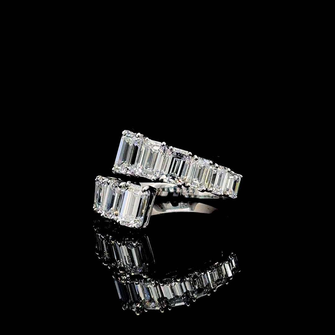 The Vesta Array ring commands attention with 12 emerald-cut lab-grown diamonds totaling 4.40 carats, each precisely set in a bold formation. Crafted in 14K white gold, this piece merges structured brilliance with architectural elegance—a powerful statement for modern icons.