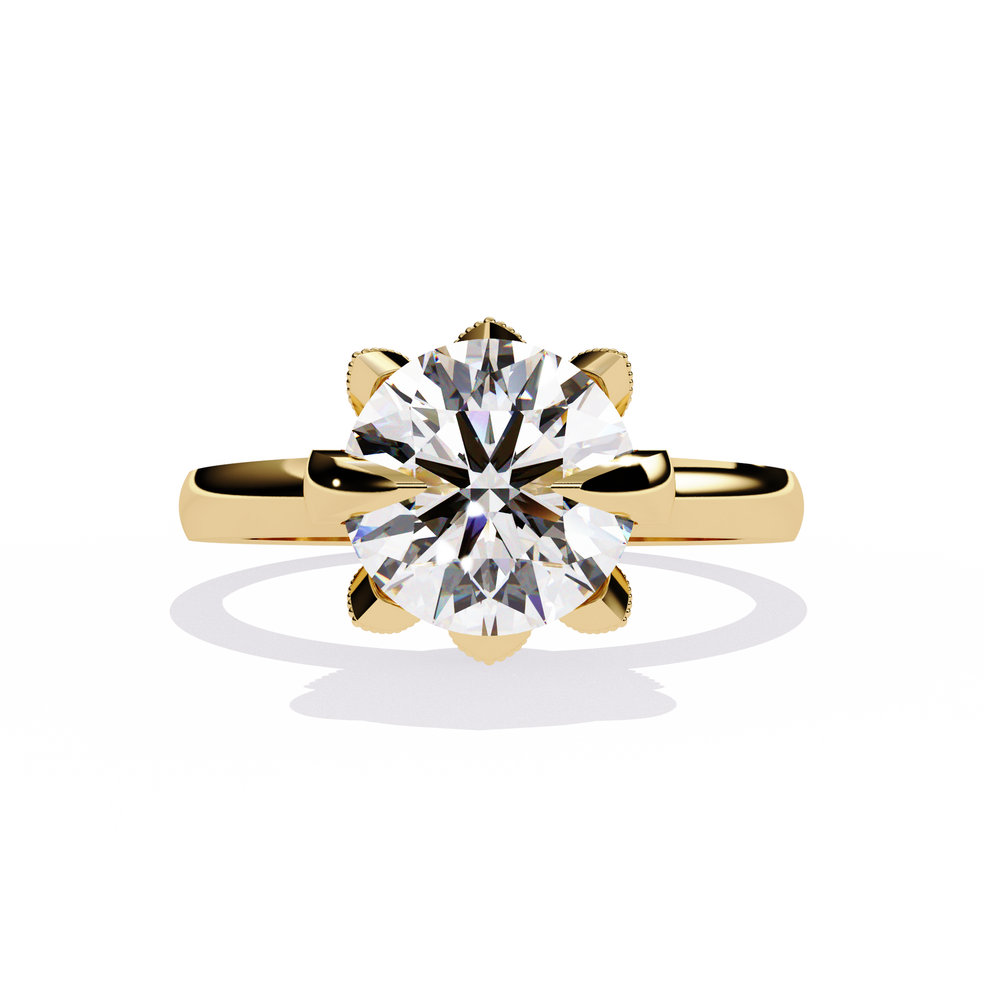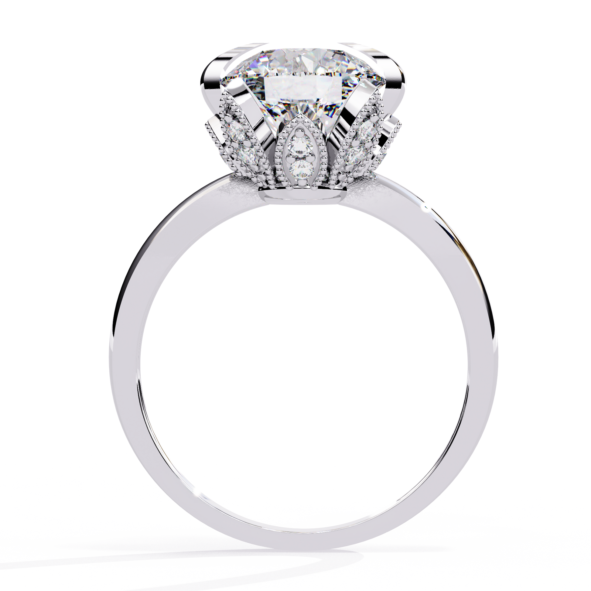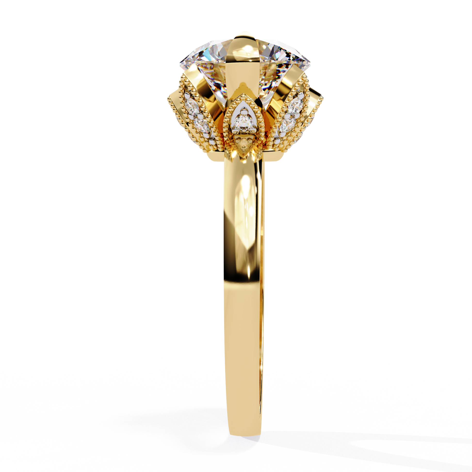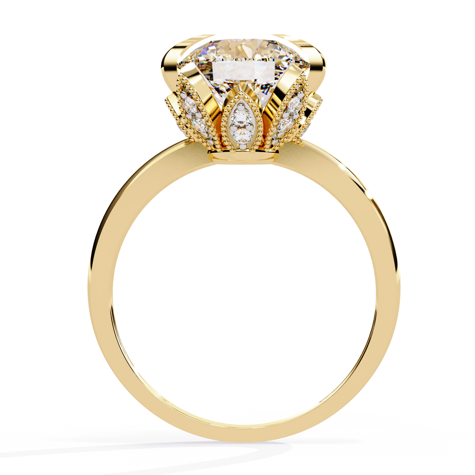 Blending regal artistry with refined craftsmanship, the Victorian Lotus ring showcases a bold 8.7 mm round lab-grown diamond seated in an ornate crown setting. Delicately engraved with petal-shaped goldwork and accented by 14 micro-set diamonds, the side profile reveals an intricate floral motif that elevates this solitaire beyond tradition.
