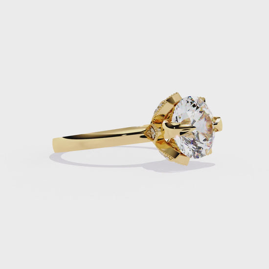 Victorian Lotus – Solitaire Diamond Ring with Engraved Crown in 14K Gold