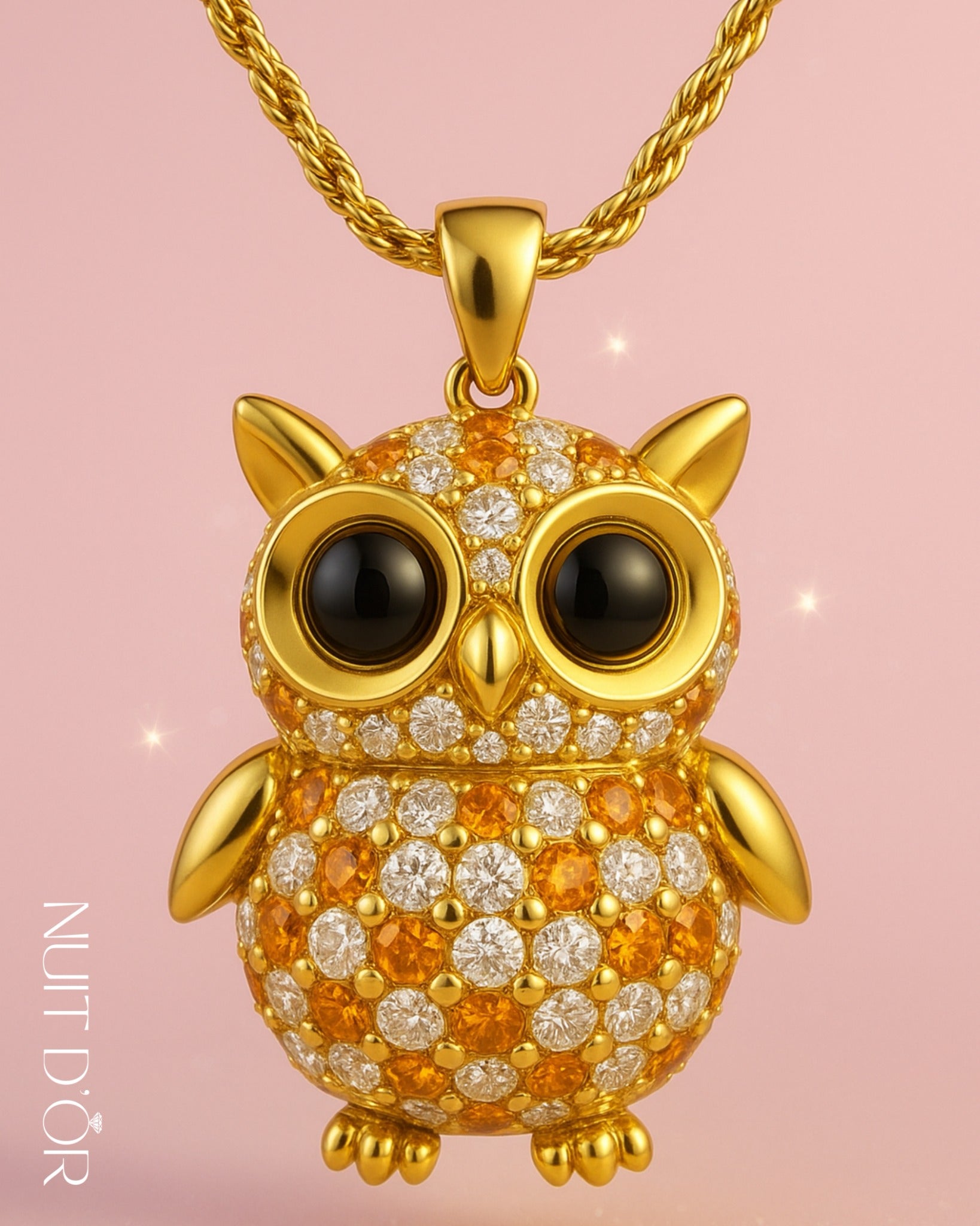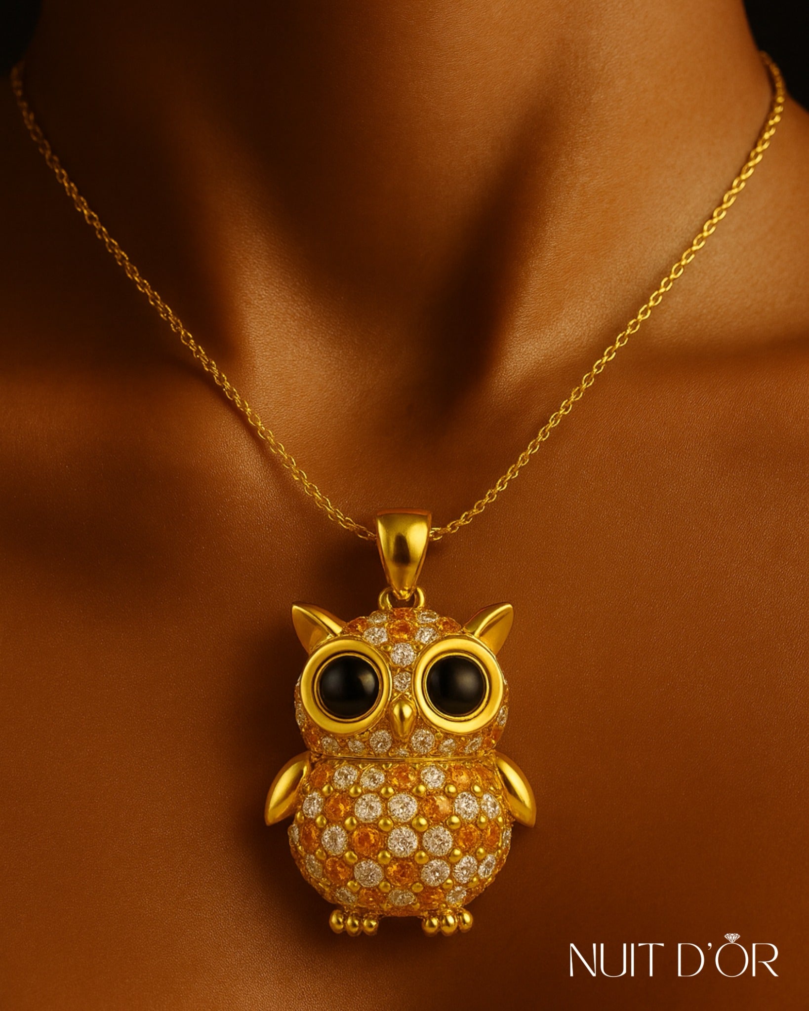 A golden owl brought to life with dazzling diamonds and fiery gemstones — a symbol of knowledge, mystery, and timeless elegance